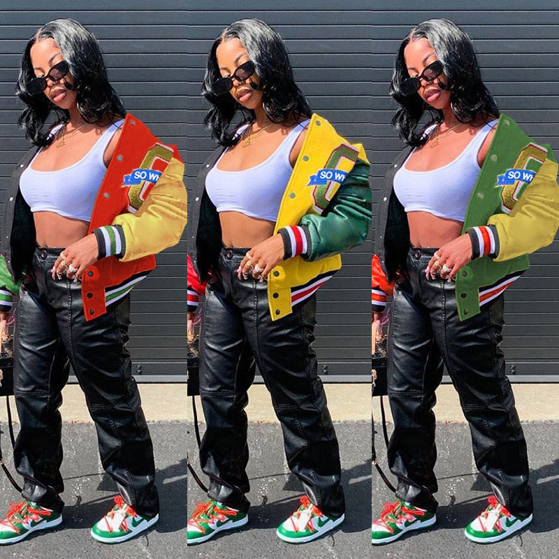 Autumn Coat Women New Warm Winter Color Block Jacket Baseball Uniform Ladies' Tops Round Neck Streetwear