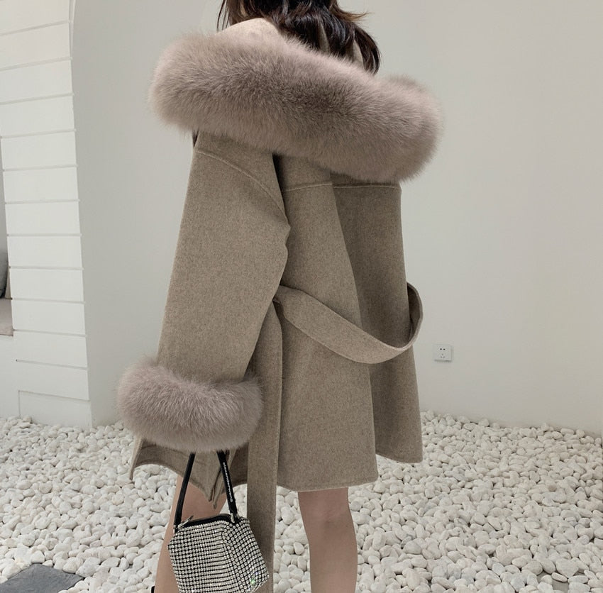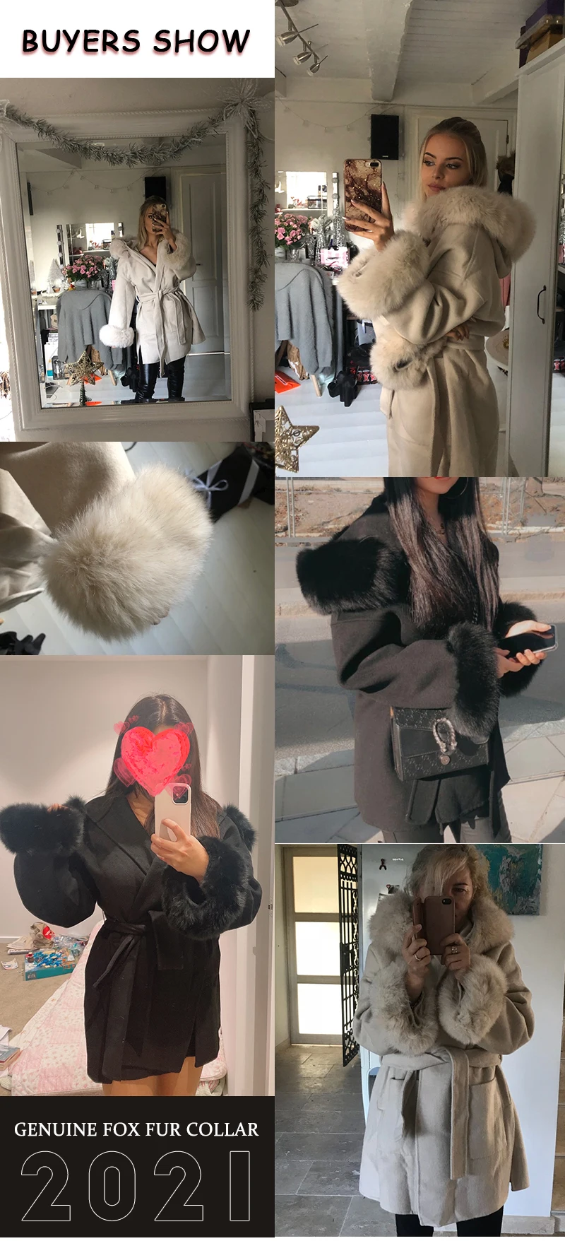 Lizakosht Luxury Oversized Real Cashmere Blend Coat Women Winter Wool Hooded Cardigan Jacket With Genuine Fox Fur Collar