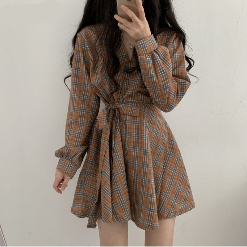 New Autumn Long Sleeve Dress Women Preppy Style Bow Palid V-neck Mini Plaid Dresses Korean High Waist Short Dress Elegant