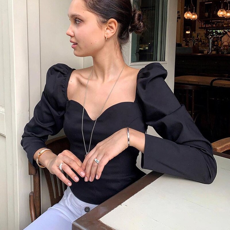 Lizakosht Korean Style Vintage Blouse Women Petal Collar Long Sleeve Sexy Clavicle Ladies Elegant Tops Fashion Casual Daily Base T-Shirt