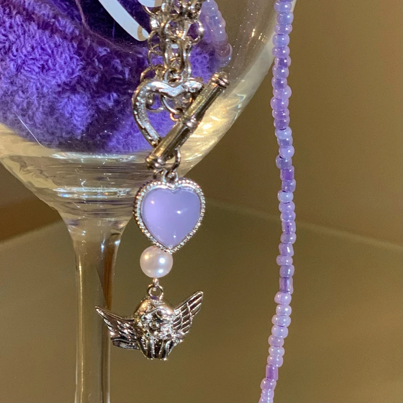 Lizakosht Wholesale Korean Fashion Heart Angel Pendant Necklace For Women Girks Trendy Purple Beads Choker Set Jewelry Gifts