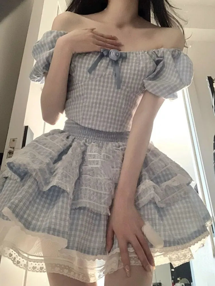 Lizakosht Sweet Plaid Fairy 2 Piece Dress Set Women Short Sleeve Y2k Crop Tops + Elegant Mini Skrits Summer Korean Fashion Suits Chic