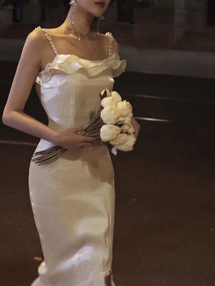 Lizakosht Midi Dresses for Women Sleeveless French Style Split Dress Sexy Club Solid Backless Spaghetti Strap New Spring Summer Dress