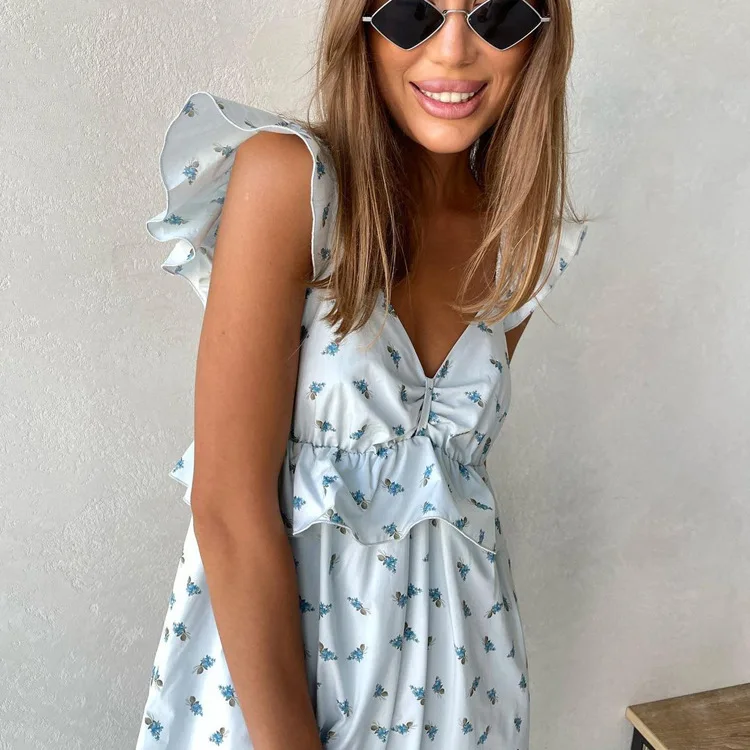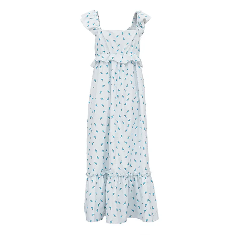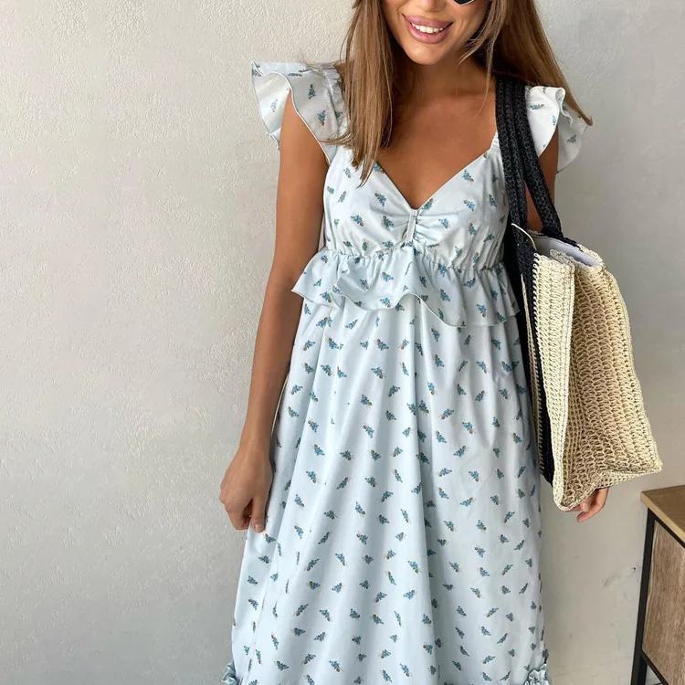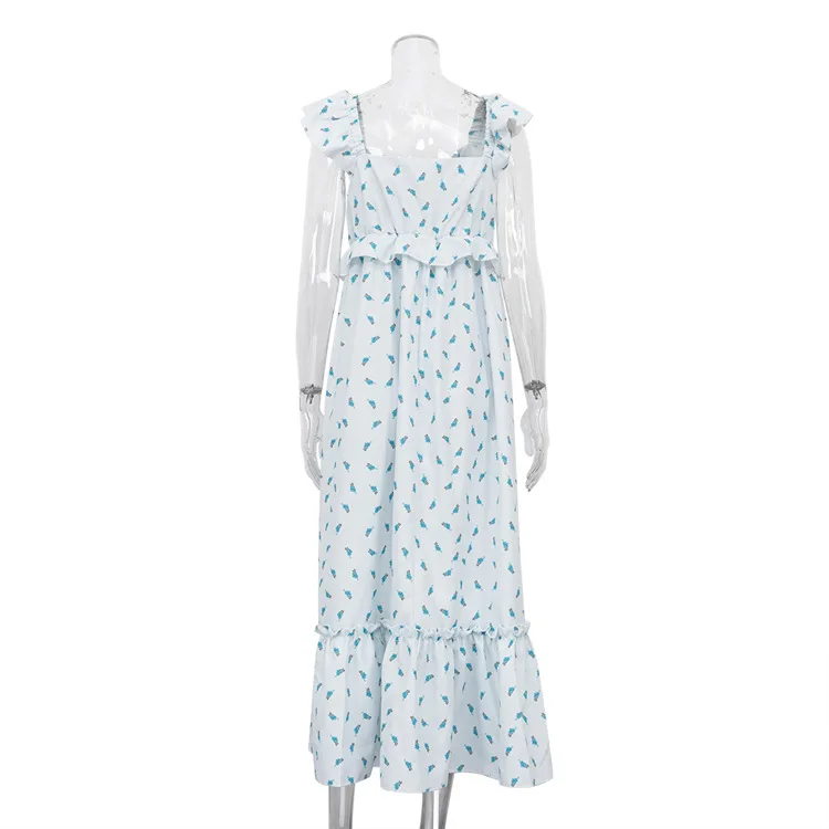 Lizakosht Women Sexy Loose Print Summer Dress Lady Fashion V-Neck Sleeveless Ankle-Length Dress Elegant Holiday Ruffle Dresses
