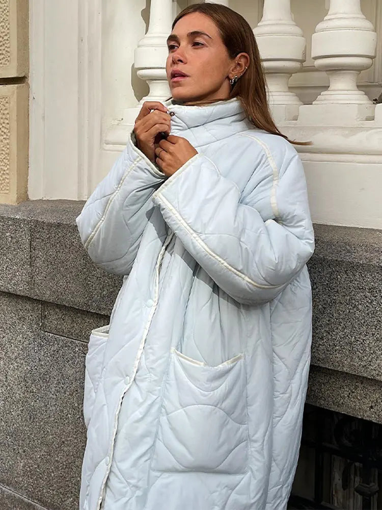 Lizakosht Solid Stand Collar Single Breasted Women Cotton Coat Loose Oversized Lazy Quilted Knee Length Jacket Winter Chic Casual Outwears