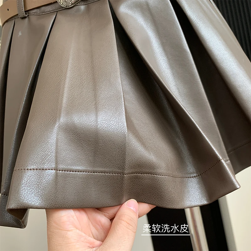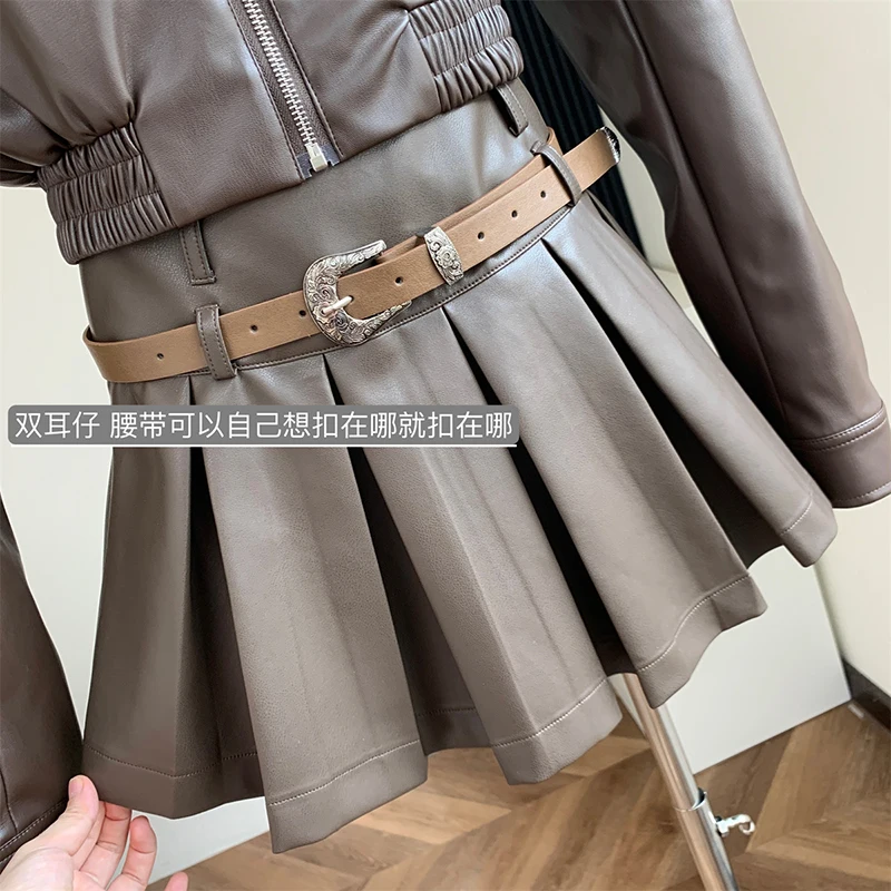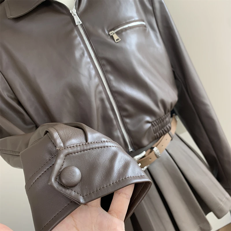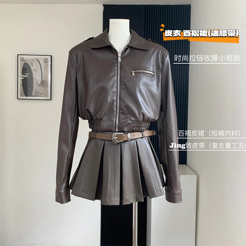 Lizakosht - Formal Occasion Outfits 2 Piece Set Classical Solid Colors PU Jacket+Wrap Hip High Street Pleated Skirts Coquette Autumn Winter