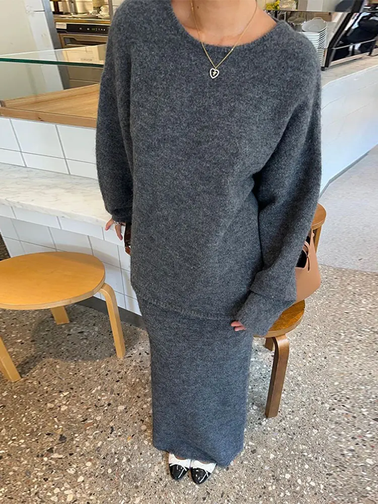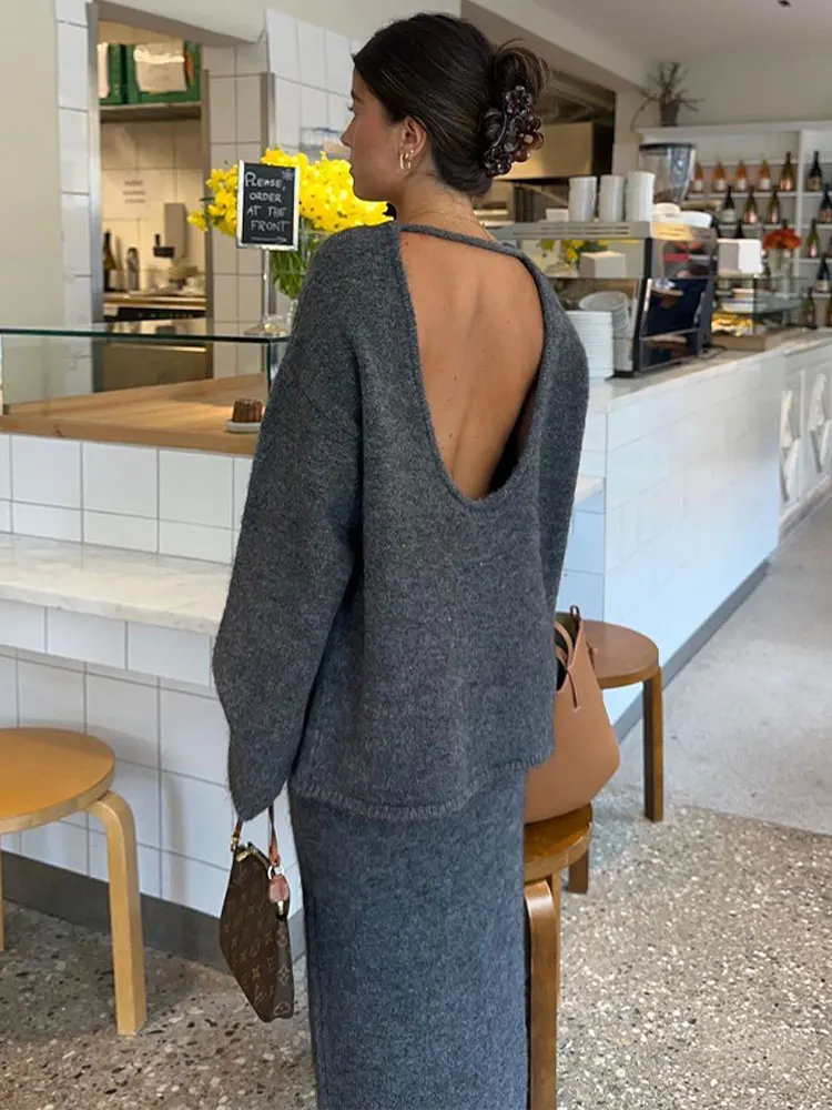 Lizakosht Vintage Women Autumn Knit Backless Top Pullover Skirt Set Long Sleeve Loose Oversize O-neck Top 2 Pcs Set Chic Casual Streetwear