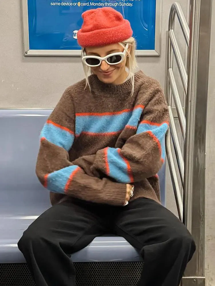 Lizakosht Vintage Knitted Stripe O-neck Women Autumn Pullover Long Sleeve Loose Warm Jumper Sweater Winter Chic Casual Lady Streetwear Top