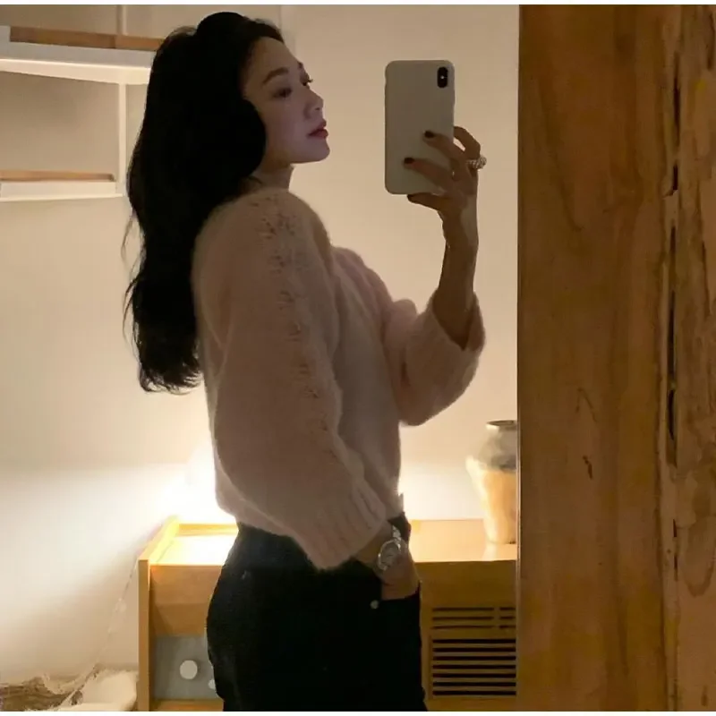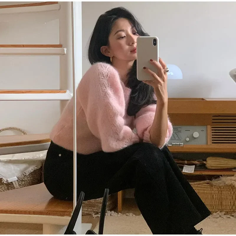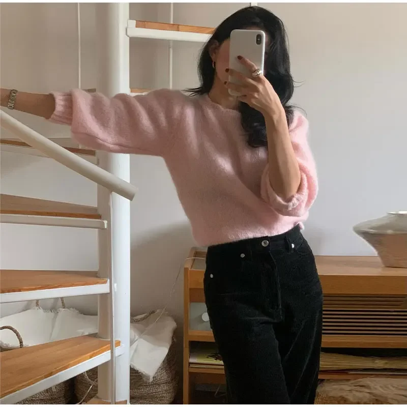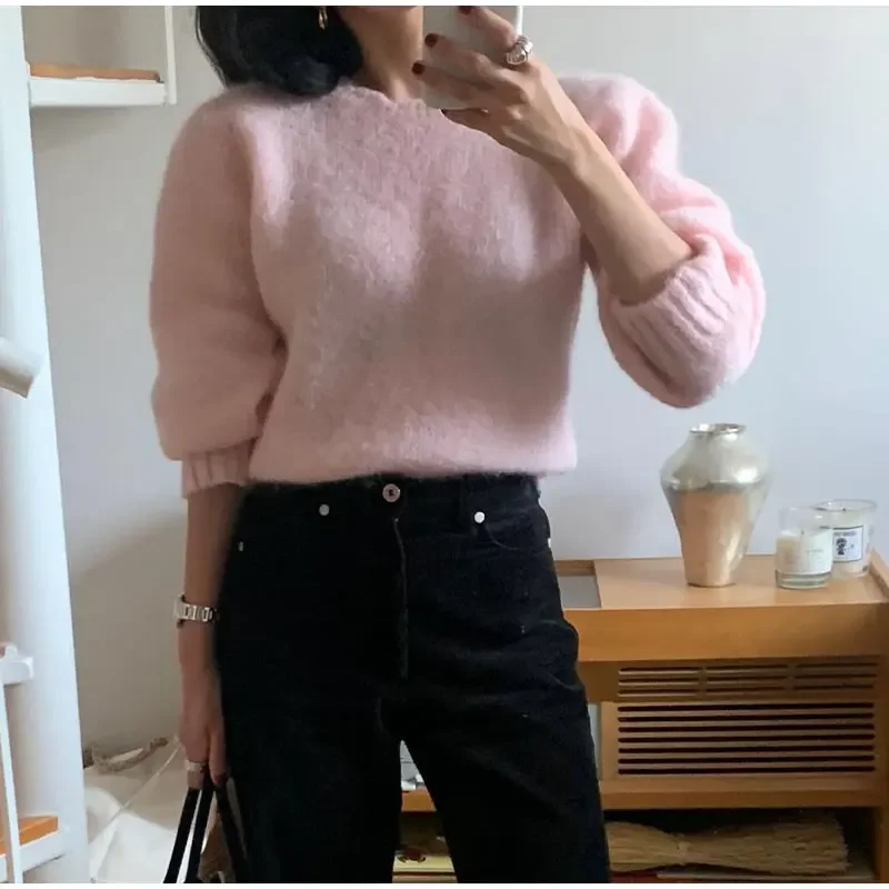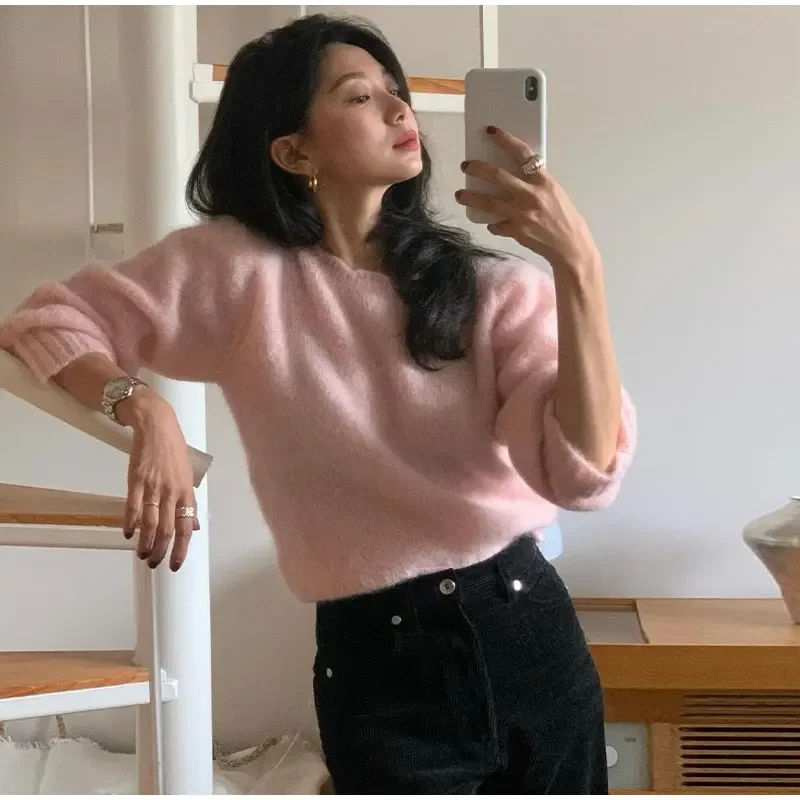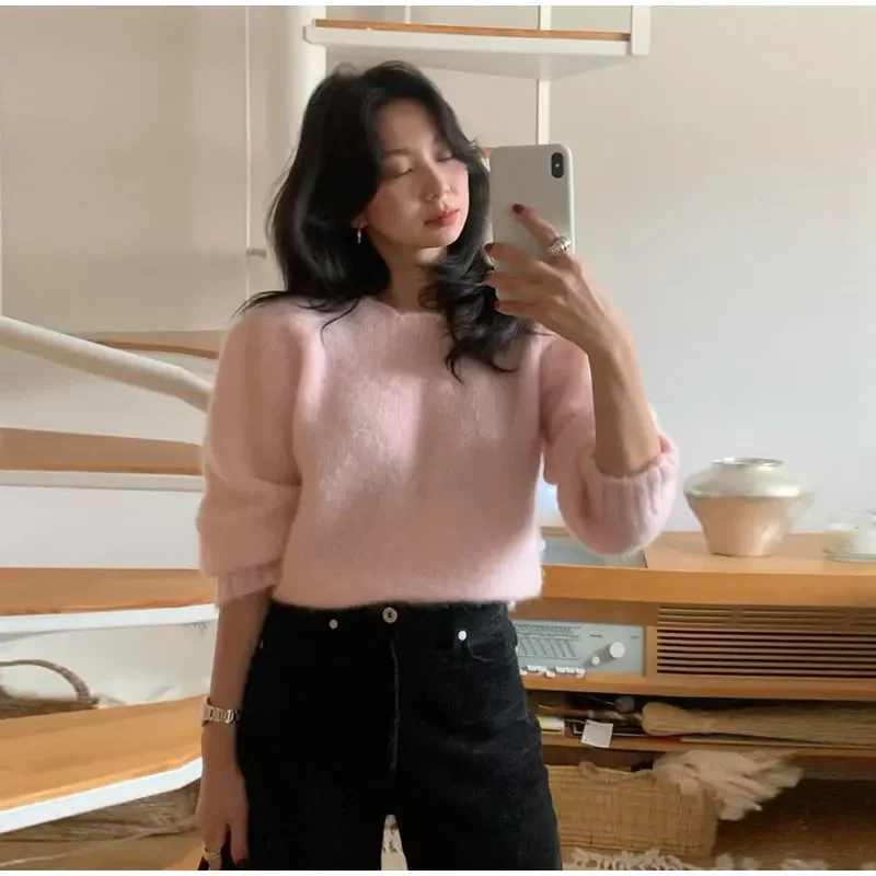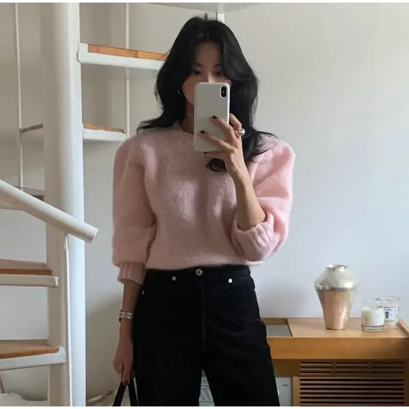Lizakosht Korean Style Sweet Pink Knit Sweater For Women Casual Crew Neck Long Sleeve Pullover Female 2024 Fashion Elegant Street Sweaters
