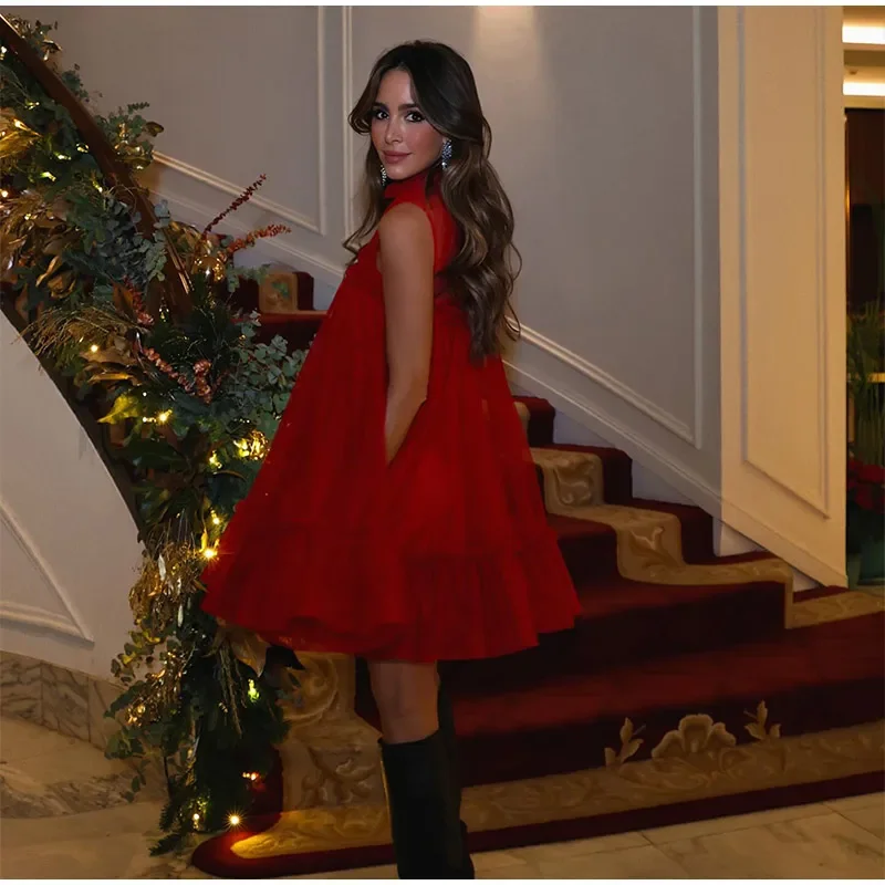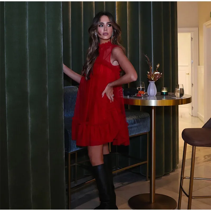 Lizakosht Fashion Red Pleated Mini Dress For Women Elegant O-neck Sleeveless Ruffles A-line Dresses Sweet Lady Chic Party Evening Vestidos