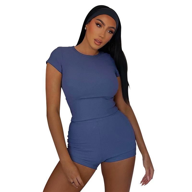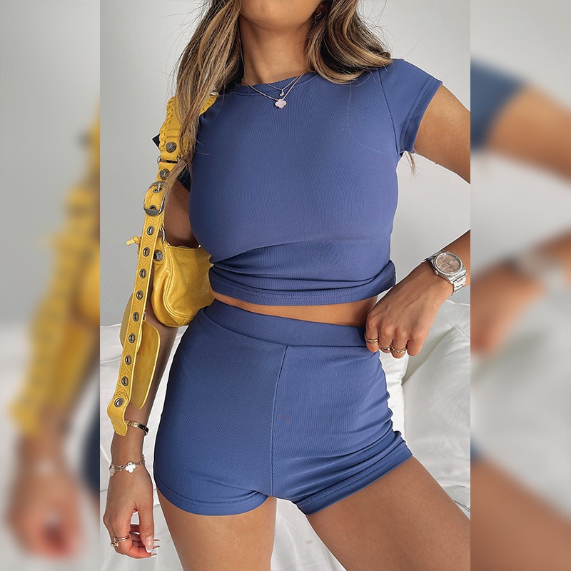 LIZAKOSHT - Women's Solid Round Neck Crop Tee & High Waist Shorts Set, Casual Cap Sleeve T-shirt & Skinny Shorts, Ladies Summer Clothes
