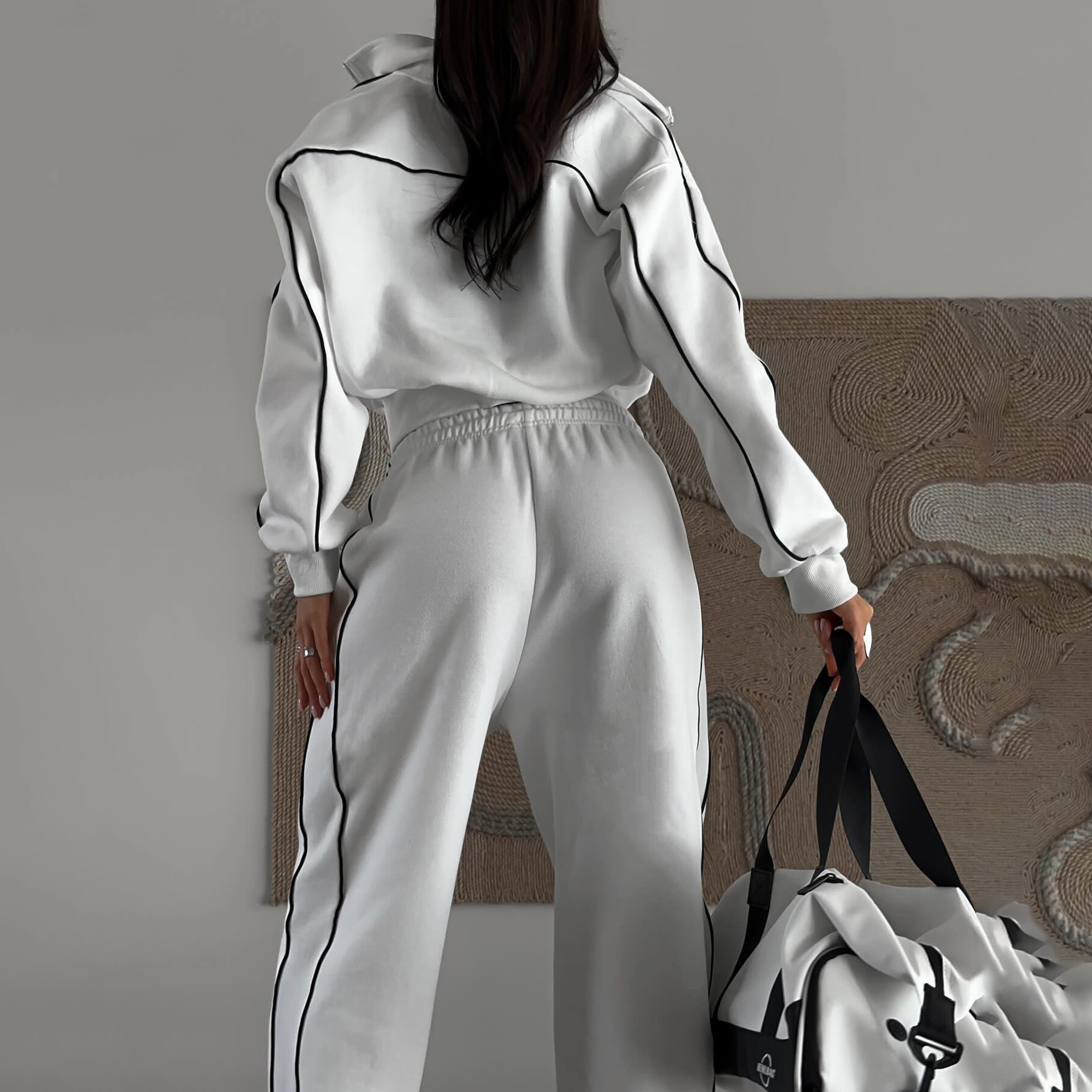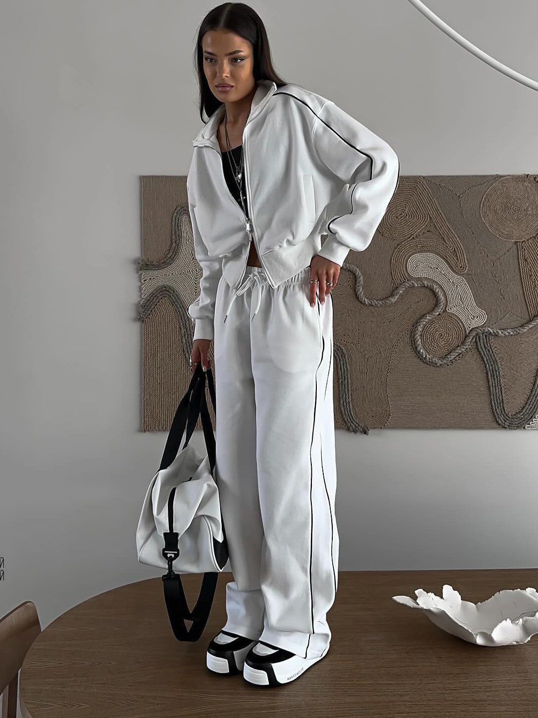 LIZAKOSHT - European and American Spring and Summer New Casual Sports Short Sweater Suit Women's Spring and Autumn Loose and Comfortable Striped Trousers Two-piece Suit