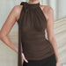 LIZAKOSHT - French Elegant Solid Color One-shoulder Neck Pleated Lace-up T-shirt