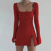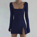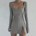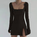 Lizakosht  Elegant Square Neck Ribbed Black Dress Female Knitted Side Split Bodycon Dress Long Sleeve Fashion Mini Dresses Basic