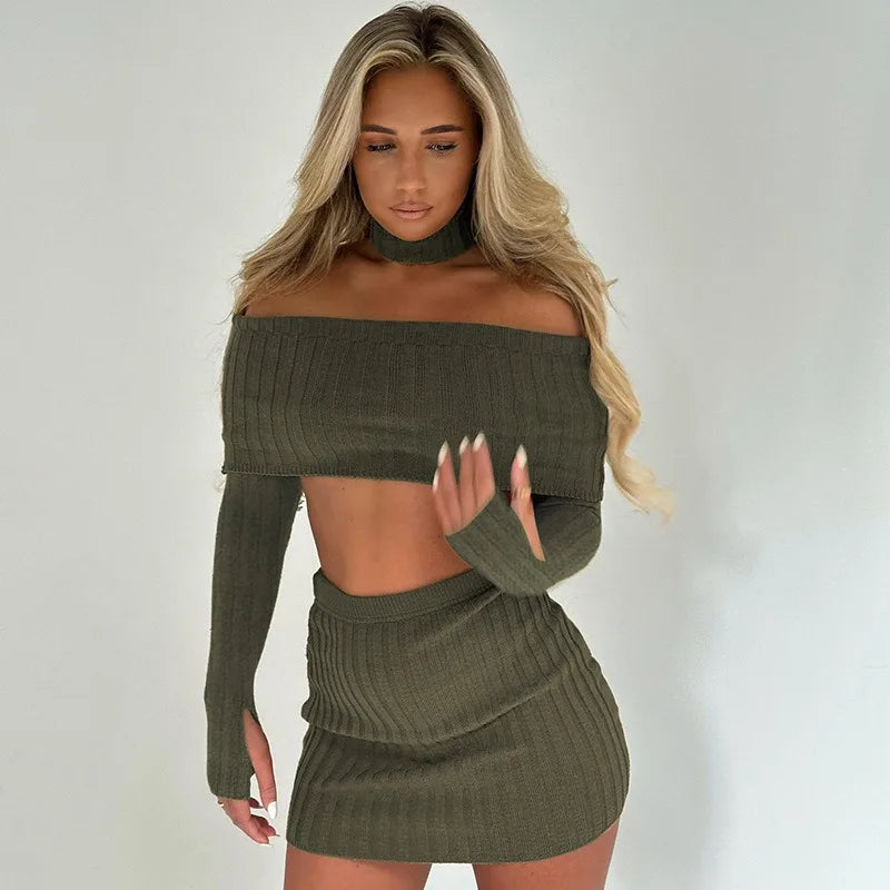 Lizakosht 2 Pieces Set Ribbed Slash Neck Long Sleeve Sexy Slim Crop Top Skirt Matching Sets Autumn Spring Fashion Party Outfit Skirts Set