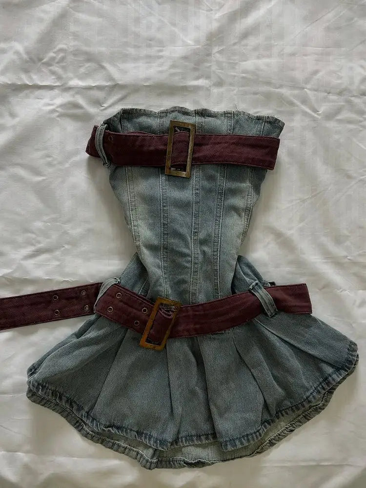 LIZAKOSHT - 2000s Vintage French Style Slim Fit Dress Women Blue Elegant Denim Strapless Dresses New Summer Y2k Off Shoulder Casual Clothing