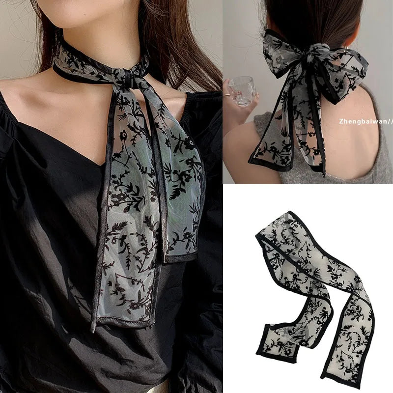 LIZAKOSHT 2024 Spring Summer Retro French Lace Scarf Women's Black Flocking Small Fragrant Wind Ribbon High end Small Scarf Headband