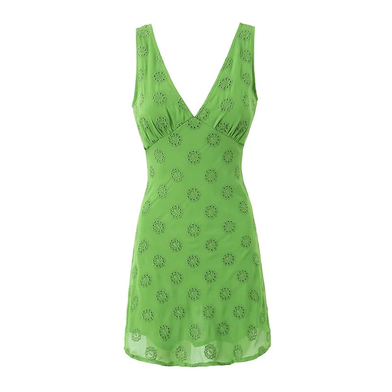 LIZAKOSHT - 2024 Women Green Floral Embroidery Tank Summer Dresses Sexy Sleeveless V Neck A-line Short Dress