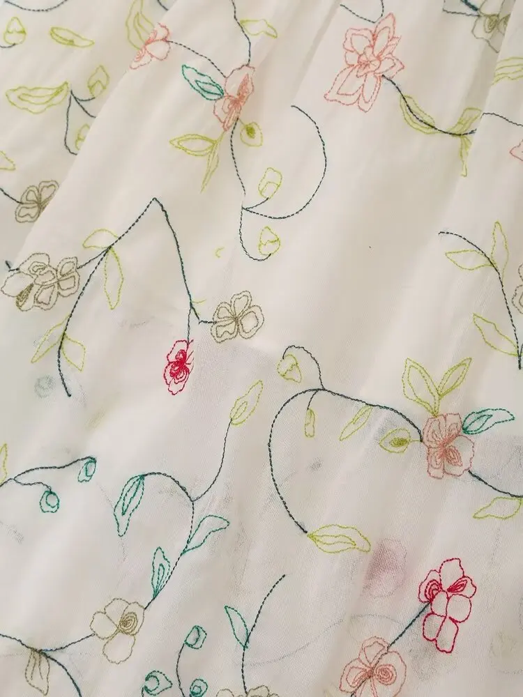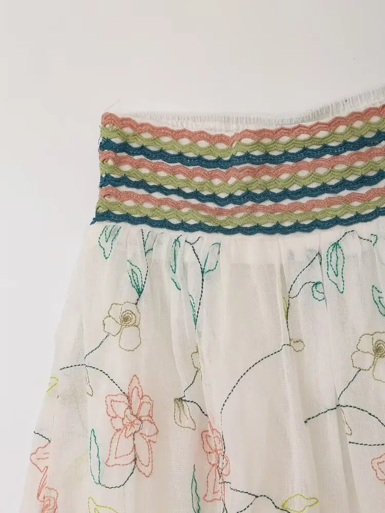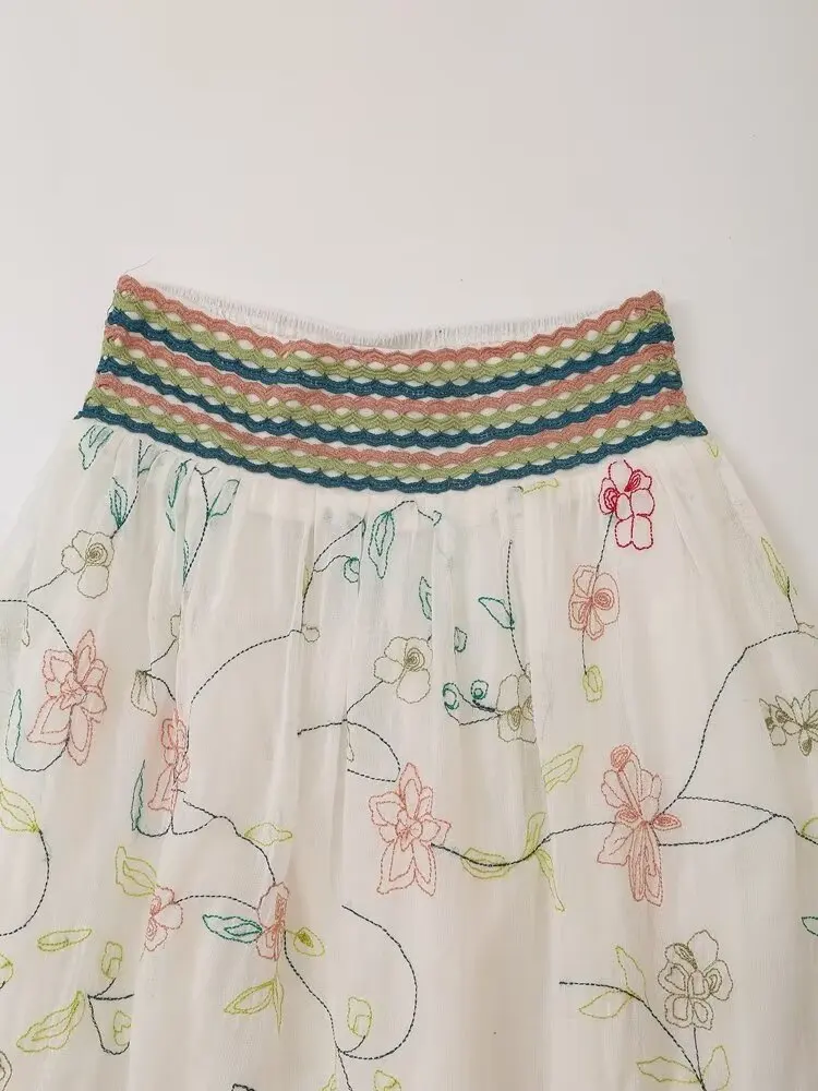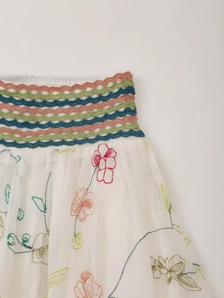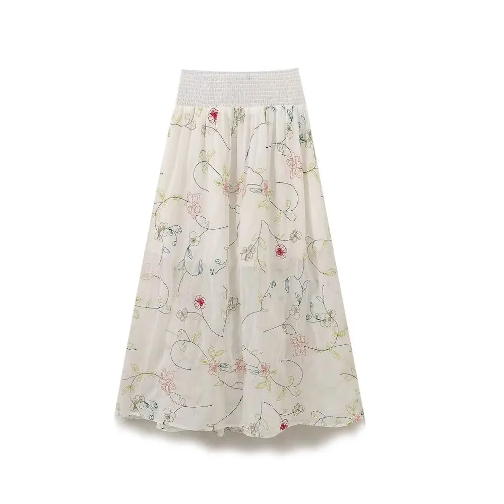 2024 Women Vintage Elastic High Waist Floral Embroidery Midi Skirt