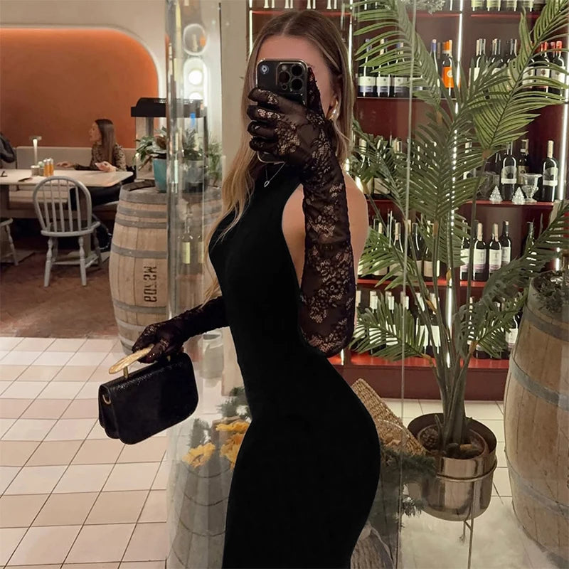 LIZAKOSHT - 2025 Ladies Classic Backless Hanging Neck Off-shoulder Fashion Sexy Bodycon Package Hip Split Hem Maxi Dress Party Clothing