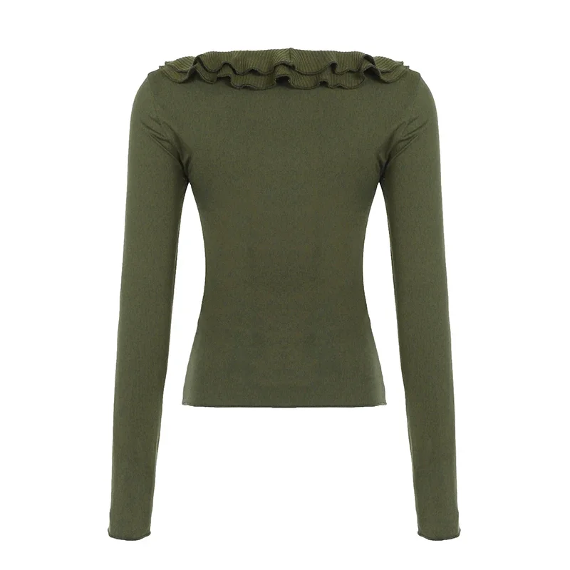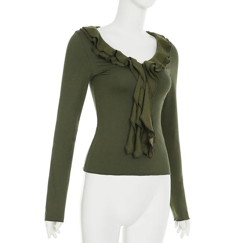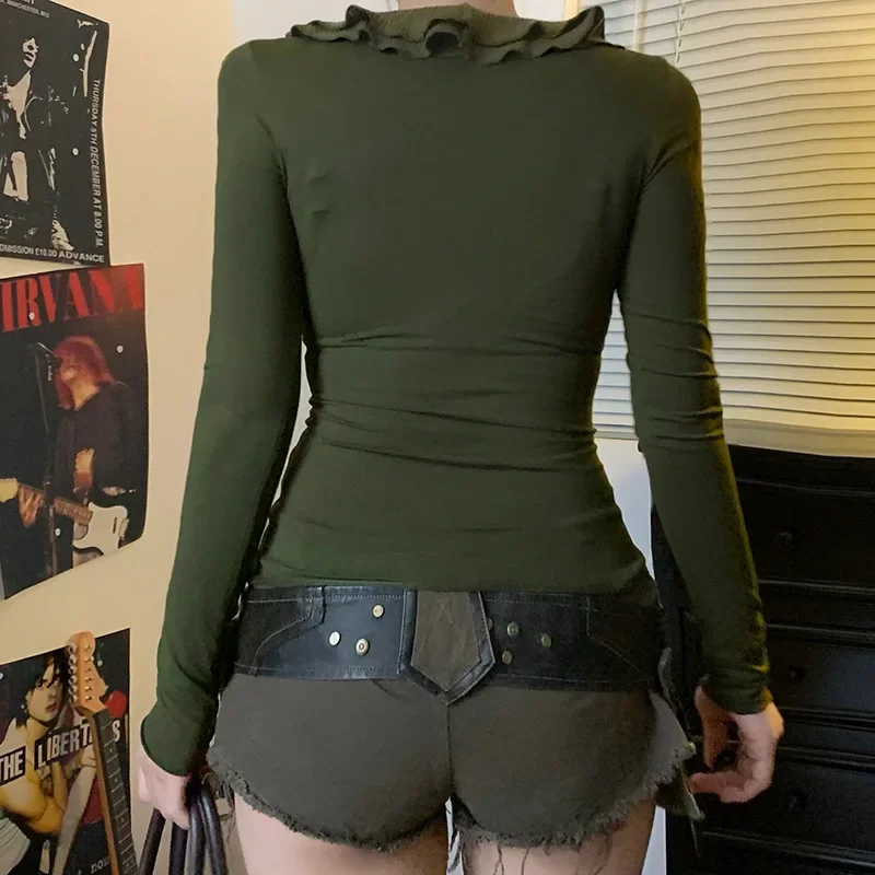 LIZAKOSHT - 2025 New Vintage Green T-shirts Women Aesthetic Elegant Sweet Soft Y2k Gothic Ruffle Patchwork V-neck Long Sleece Crop Tee Tops