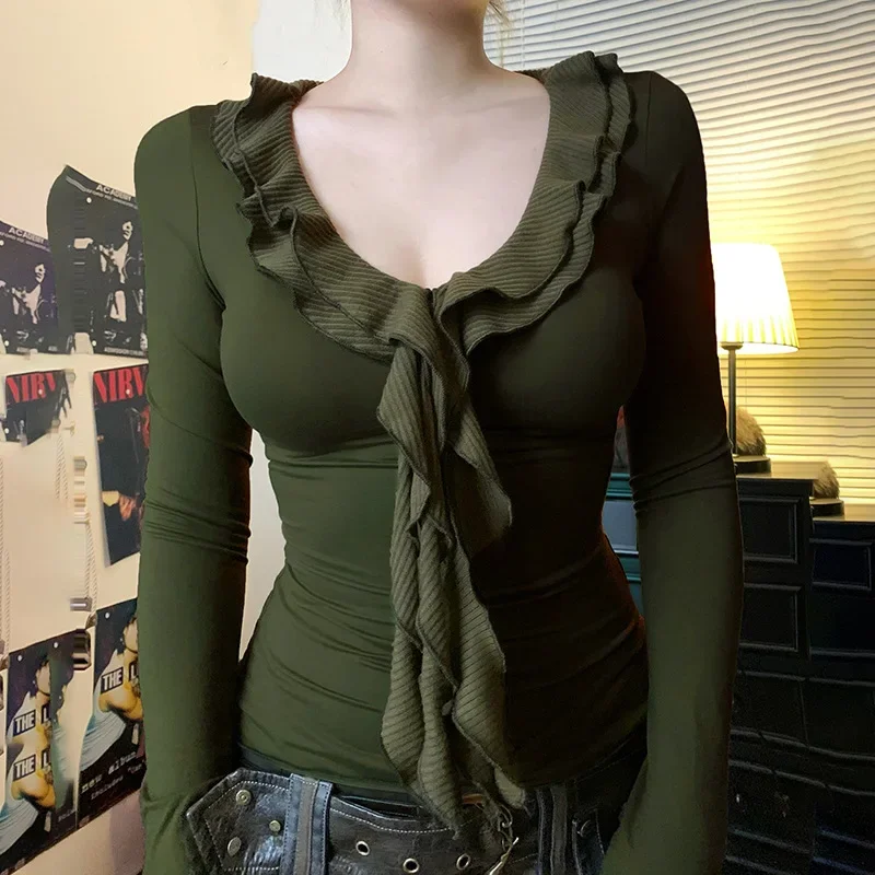 LIZAKOSHT  -  2025 New Vintage Green T-shirts Women Aesthetic Elegant Sweet Soft Y2k Gothic Ruffle Patchwork V-neck Long Sleece Crop Tee Tops