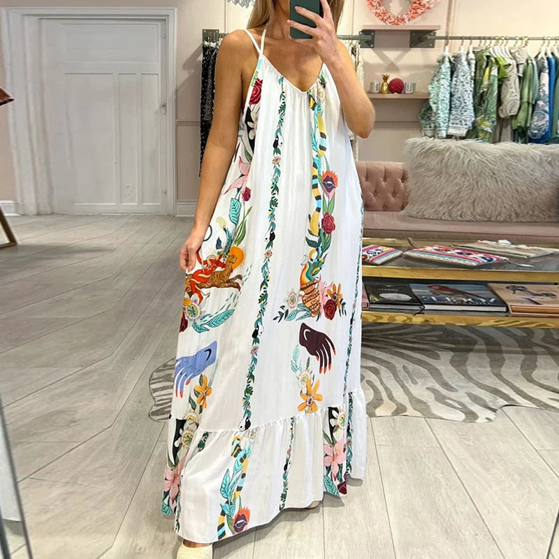 LIZAKOSHT - All Match Draped Female Pleat Dress Vintage Loose Suspender Beach Dress 2024 Women Pattern Printed Sleeveless V-neck Maxi Dress