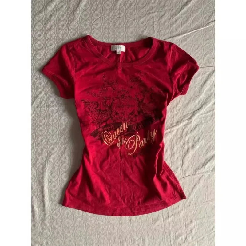 LIZAKOSHT - American Retro Short Sleeve Red T-shirt Women's Summer New Slimming Vintage Chic Fashion Top Casual Simple Elegant Ladies Tees