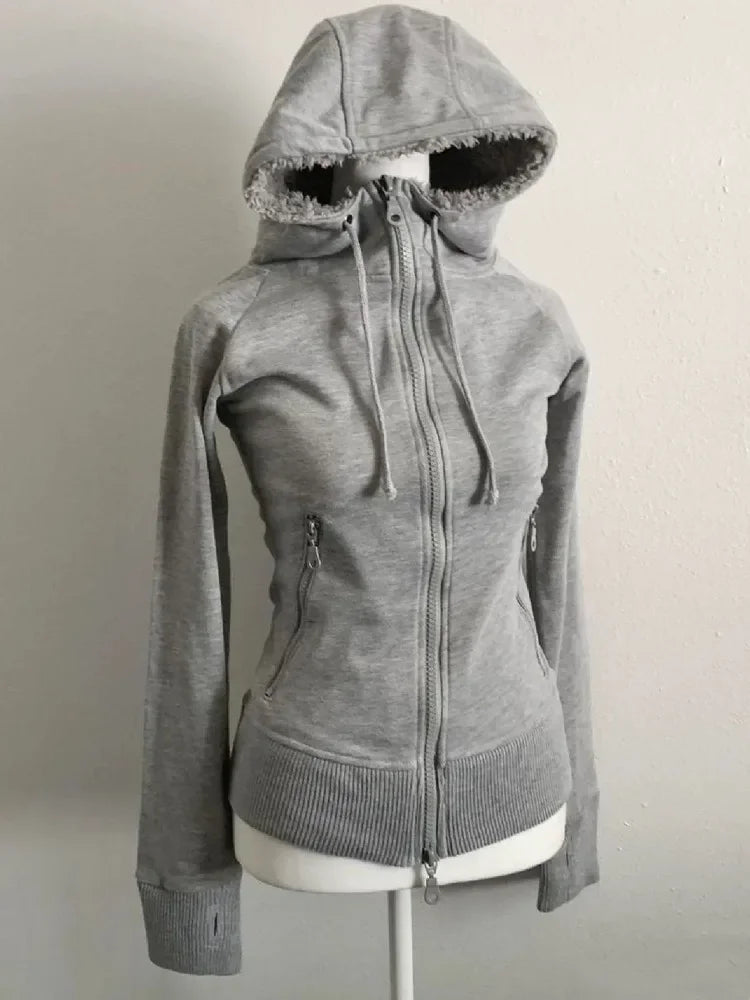 LIZAKOSHT - American Retro Solid Color Zipper Slim Sweatshirt Stylish Zippered Hooded Lambswool Sweatshirt Harajuku Hip Hop Y2k Sweatshirt