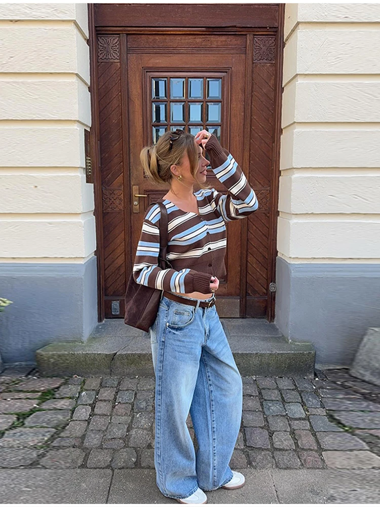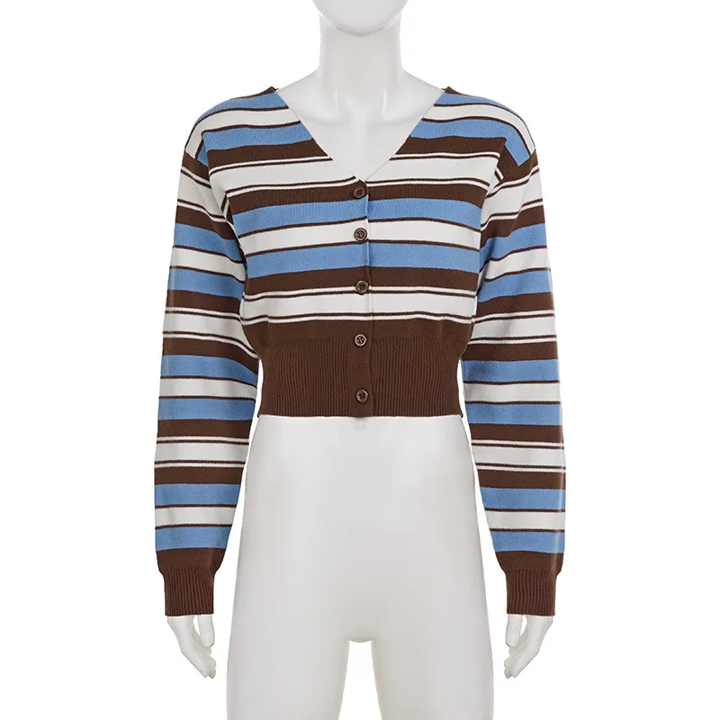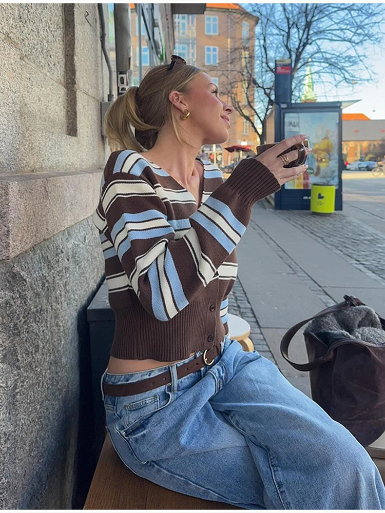 LIZAKOSHT  -  American Street Y2k Knitted Cardigan Personalized V-neck Striped Sweater Top Spicy Girl Fashion Short Versatile Thin Knitwear