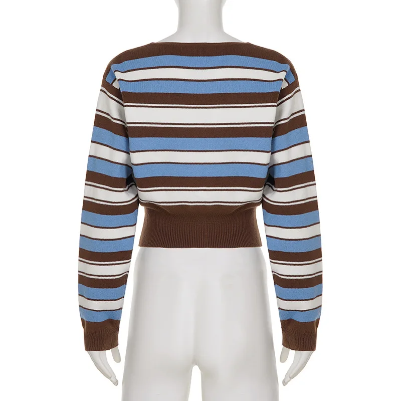 LIZAKOSHT - American Street Y2k Knitted Cardigan Personalized V-neck Striped Sweater Top Spicy Girl Fashion Short Versatile Thin Knitwear