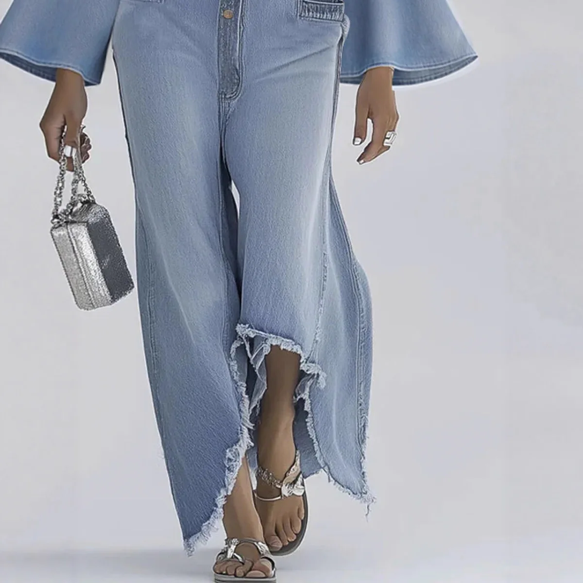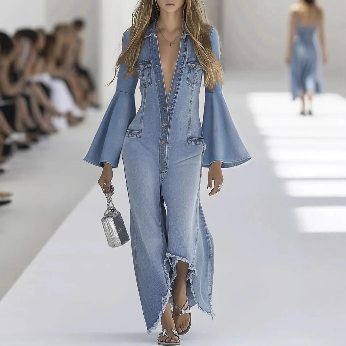 LIZAKOSHT  -  American Style Fashionable Simple Denim Jumpsuit Autumn Women Flares Sleeve Single-breasted Straight Overall Female Streetwear