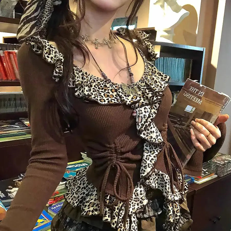 LIZAKOSHT - Ancient Long-Sleeved V-Neck Leopard Print Bottoming Shirt Women Autumn Winter New Slim Versatile Design Drawstring Top Trendy