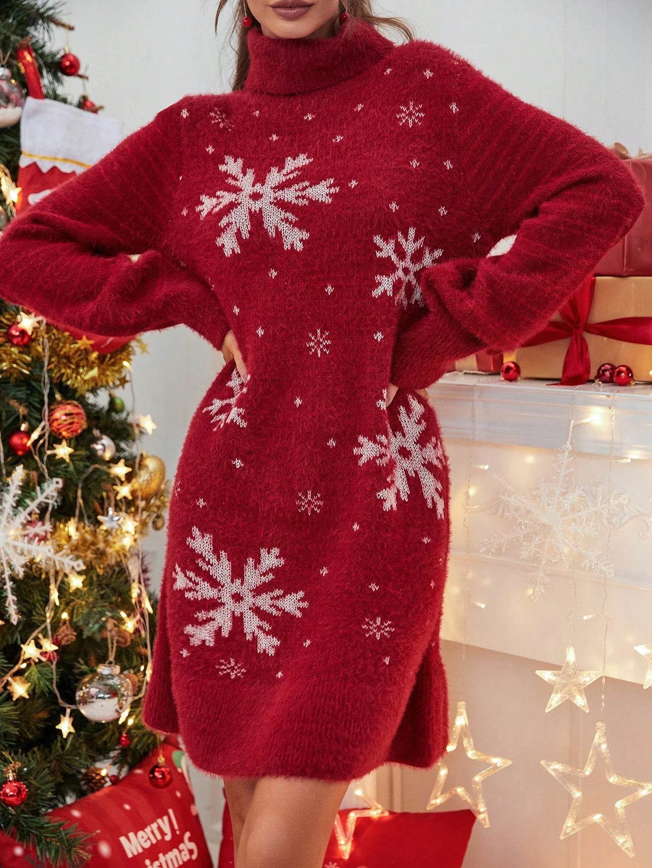 LIZAKOSHT - Autumn and winter Christmas theme white snowflake design in the long temperament casual loose knit woolen dress