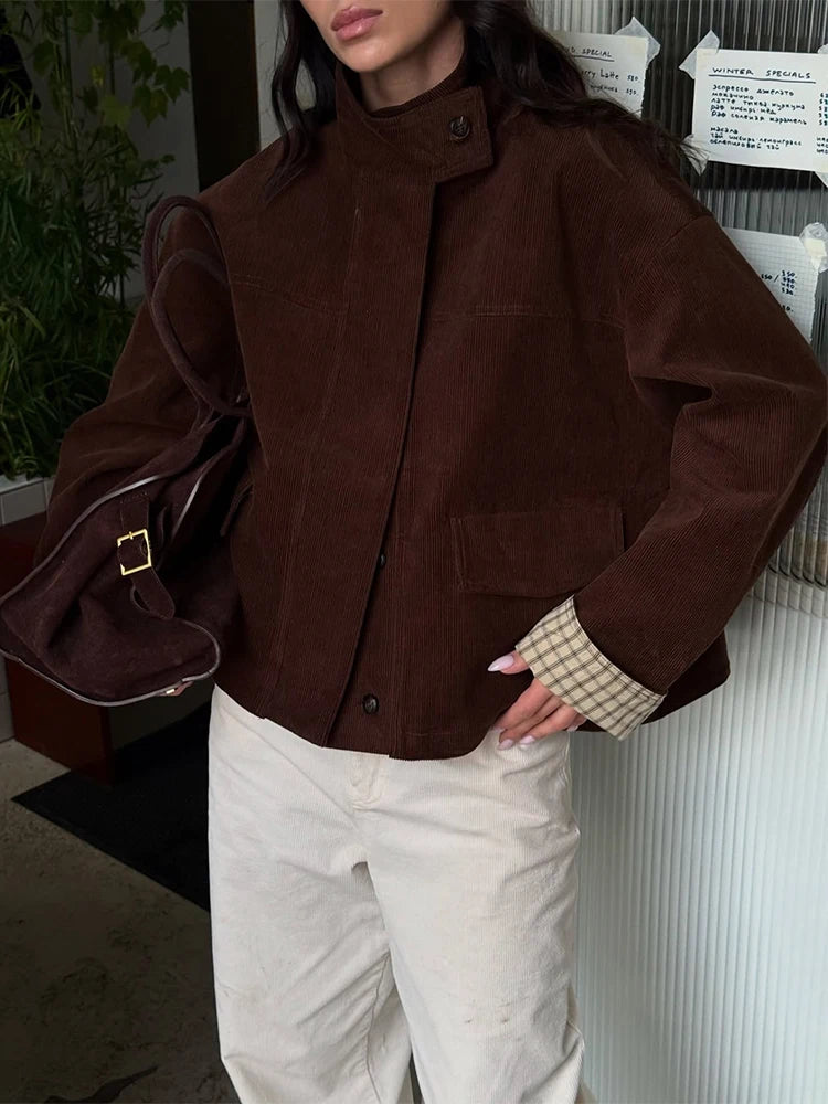 LIZAKOSHT  -  Autumn Chic Plaids Linen Solid Corduroy Coats Elegant Female Stand Collar Zipper Long Sleeves Jacket Fashion Lady Street Outwear
