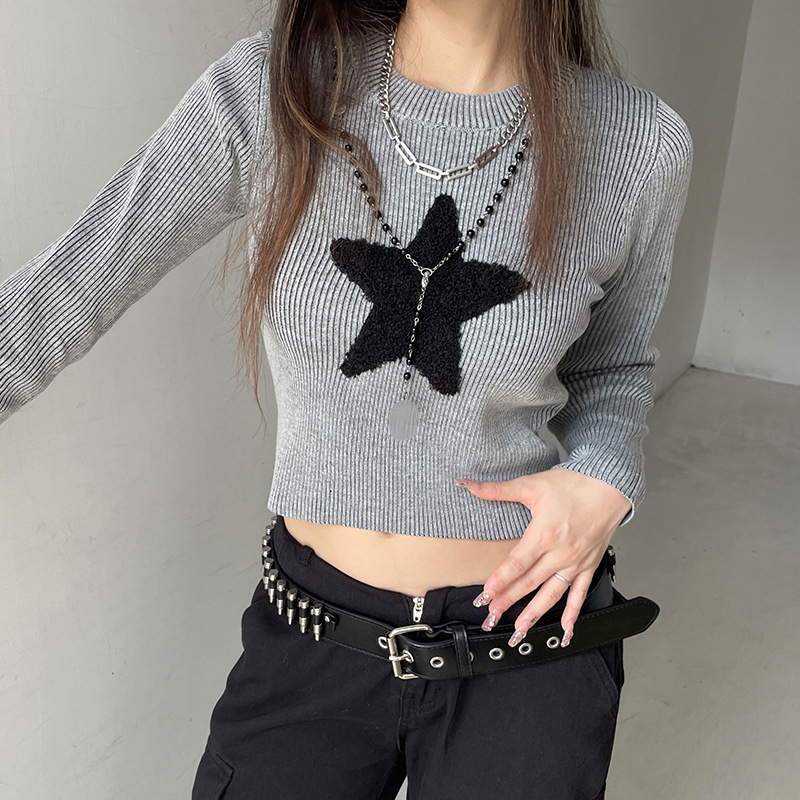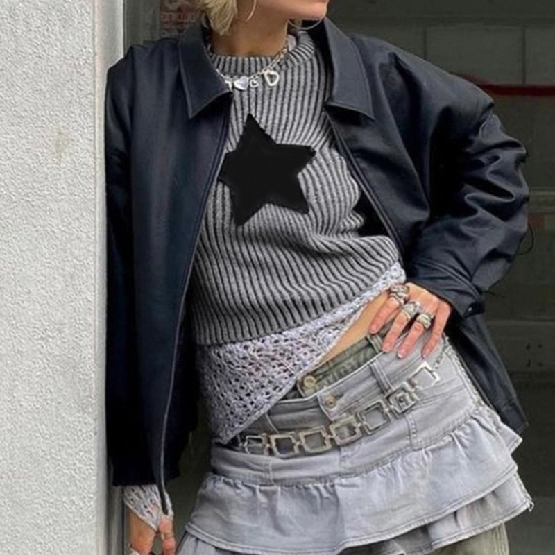 LIZAKOSHT - Autumn Fashion Star Patchwork Cropped Sweater Y2k Aesthetics Slim Tops Vintage Pullover Harajuku All Match Knitted Jumpers