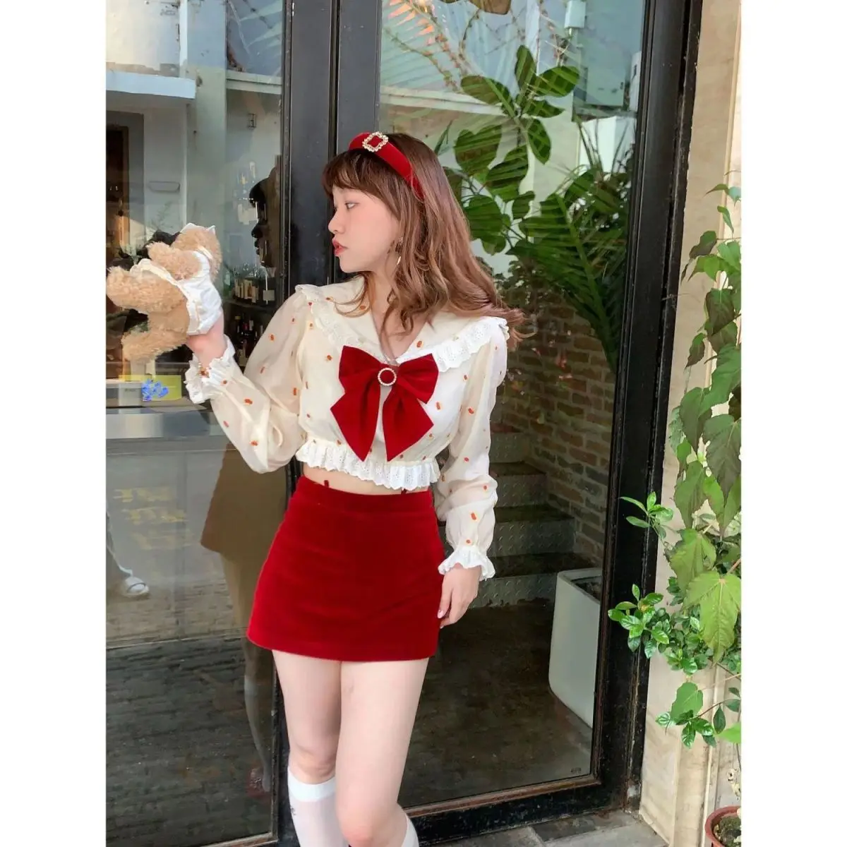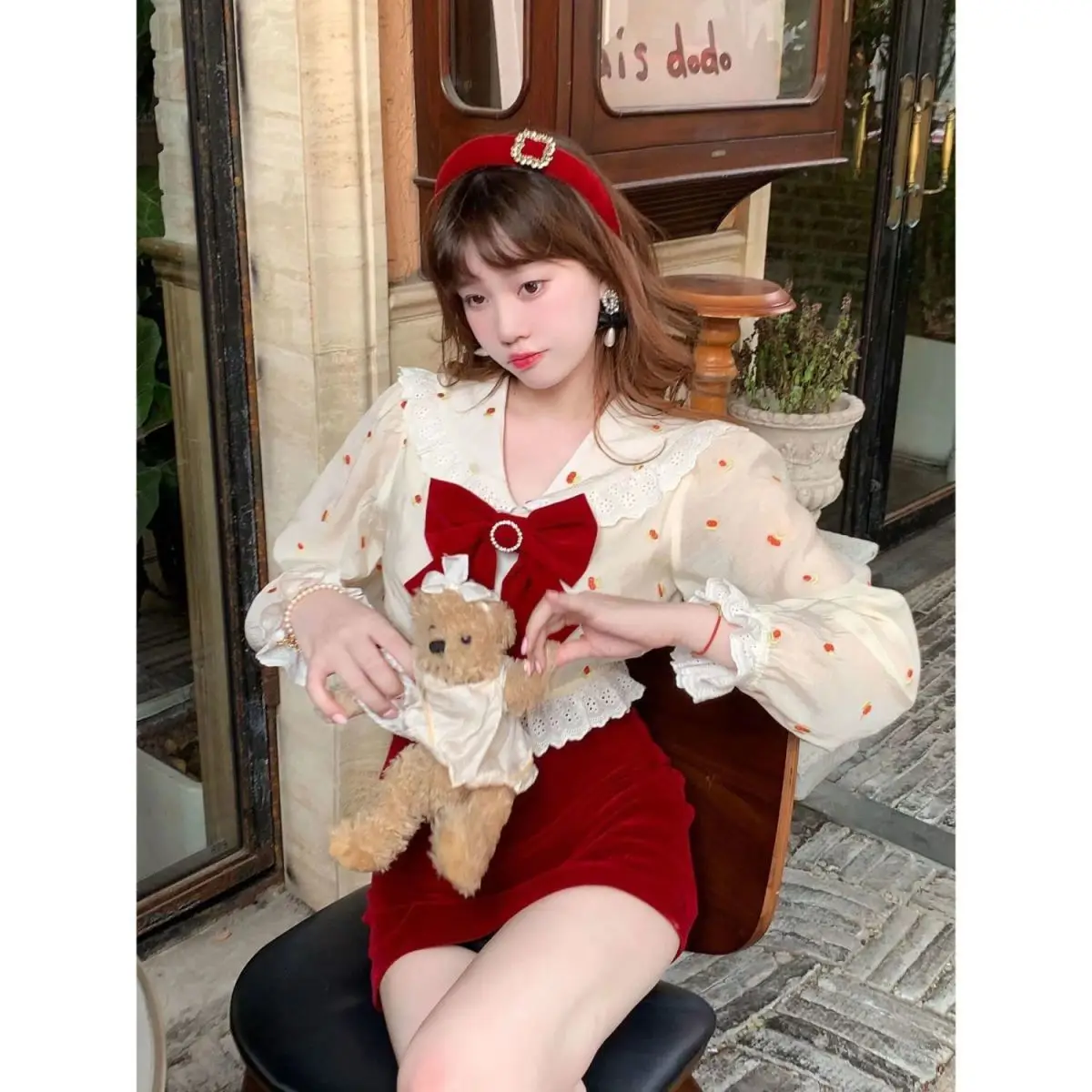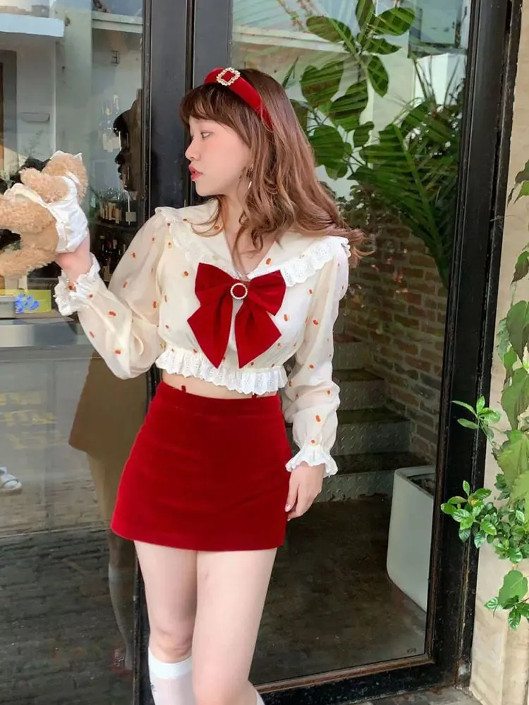 LIZAKOSHT - Autumn Korea Women 2PCS Skirt Suit Sweet Bow Polka Dot Long Sleeve Blouse+ High Waist A Line Mini Red Skirt Party Club Outfits