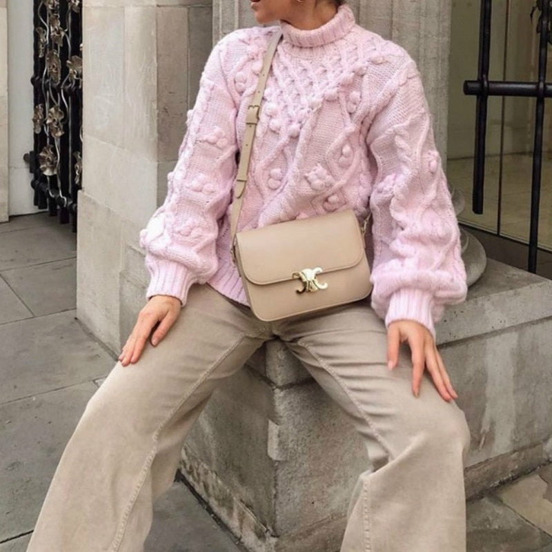 Lizakosht Autumn/Winter New Fashion All-match Solid Color Ball-shaped Knitted Long Sleeve Sweater Korean Pink Casual Loose Sweater