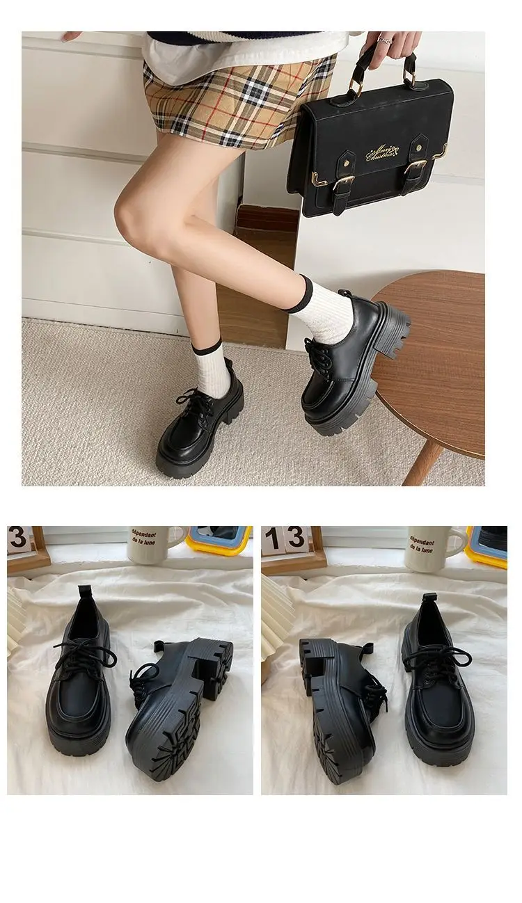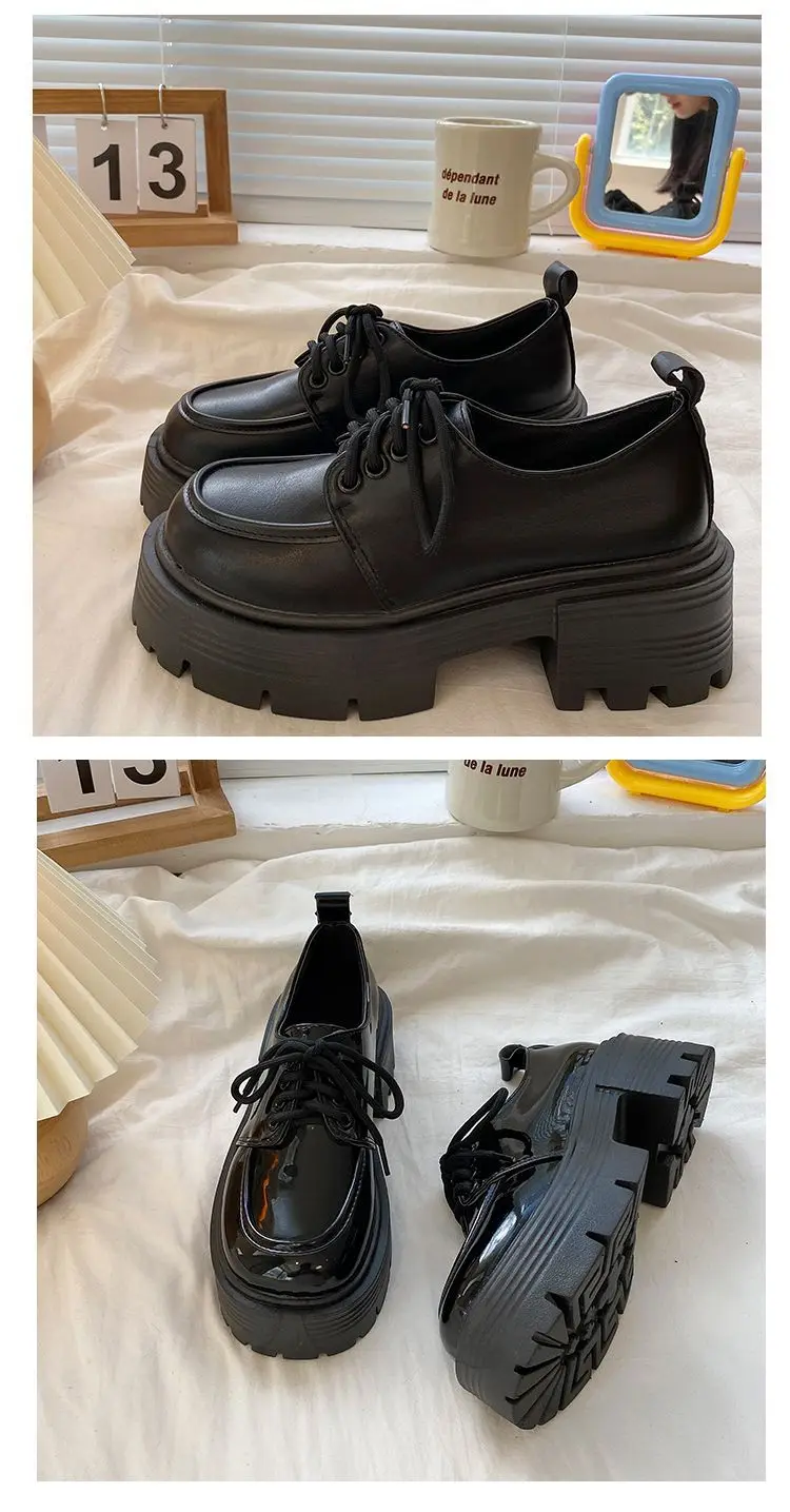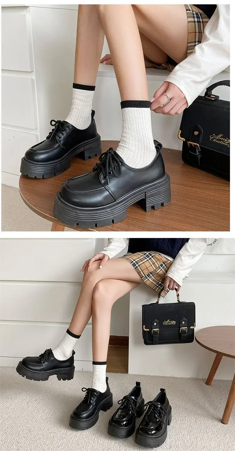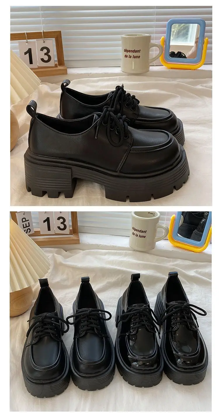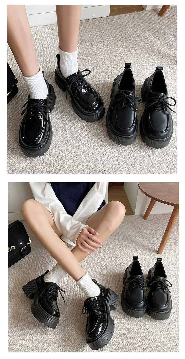LIZAKOSHT - Autumn Women Black Platform Basic Mary Jane Shoes Flats Clogs Prepppy Style Leather Shoes British Style Lace Up Pumps Shoes