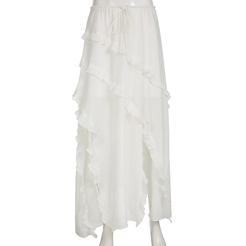 LIZAKOSHT - Beach Holiday Ruffles Long Skirts Lace Up Low Waist Y2K Aesthetic Loose Split Maxi Skirt Women Summer Grunge Fairycore