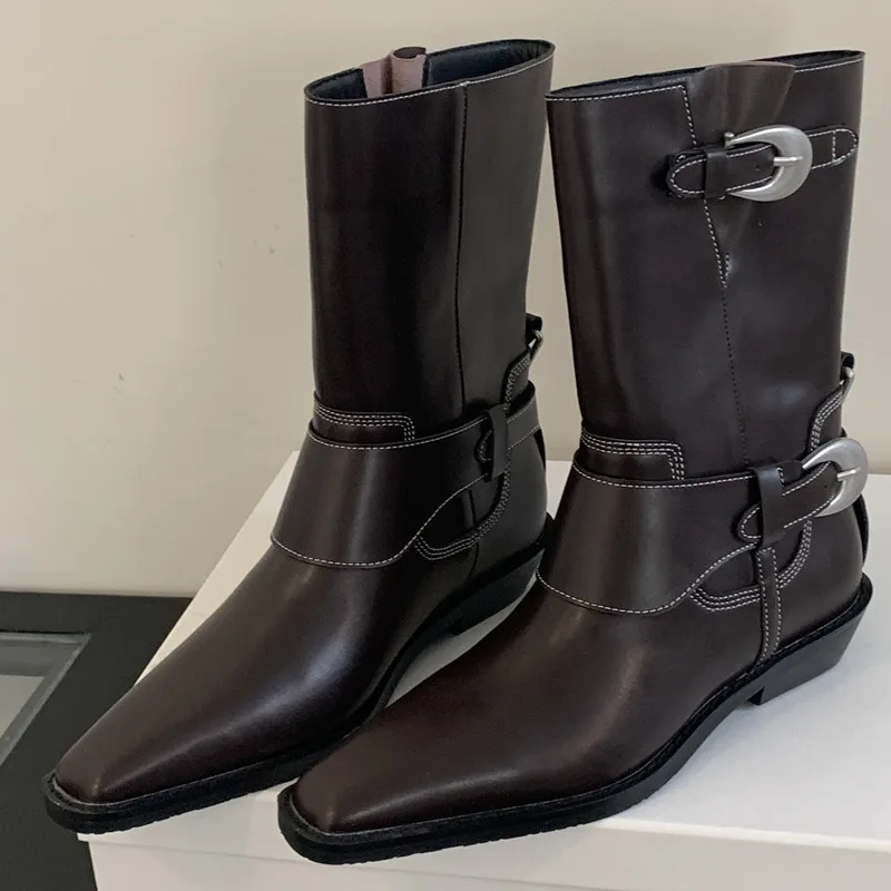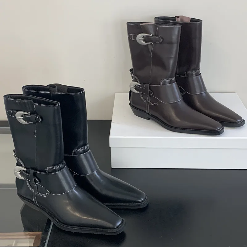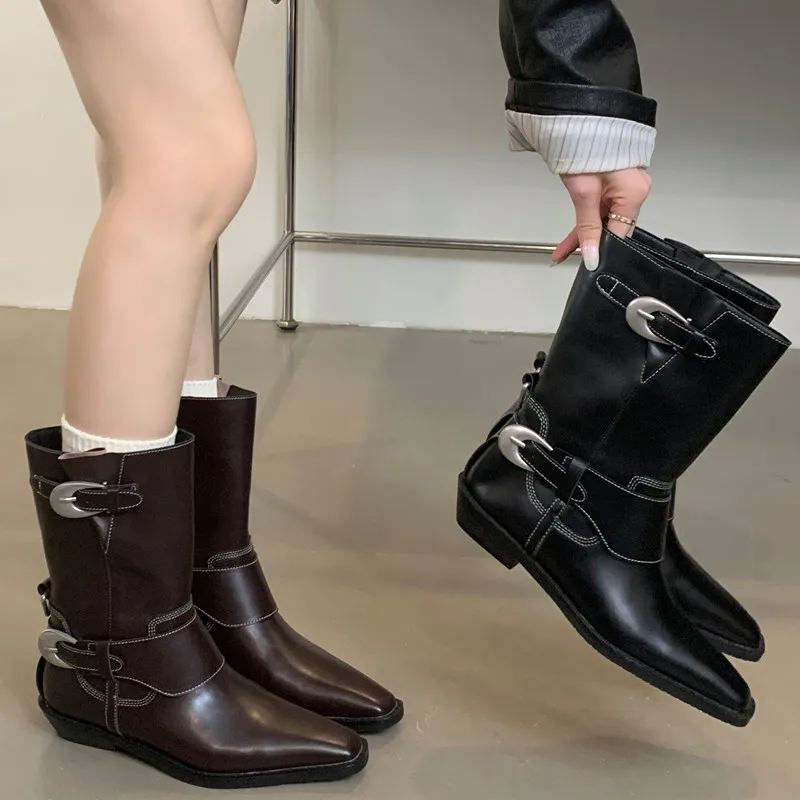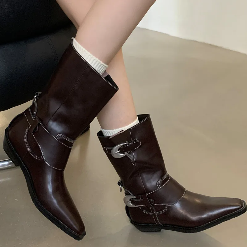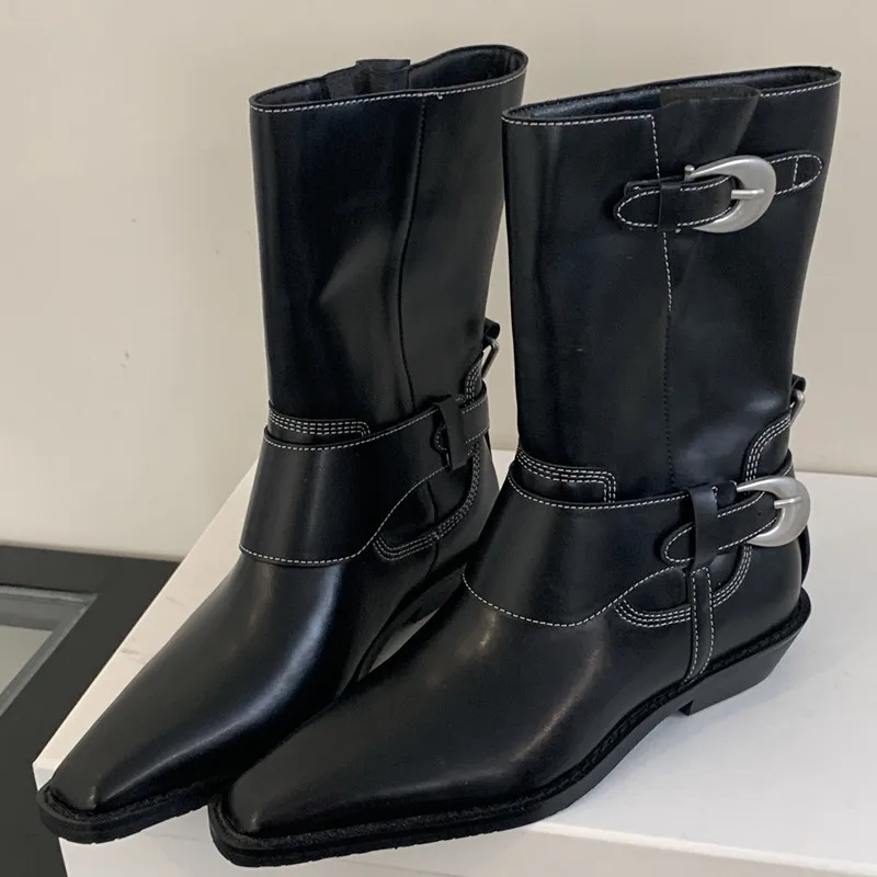 LIZAKOSHT - Belt Buckle Chelsea Boots For Women Mid Heel Western Pointed Toe Retro Solid Color Female Shoes Designer New Sewing All-matching