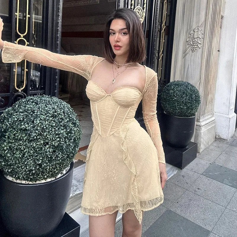 Lizakosht Bikini Cover Up Women Summer Outfit Swimsuit Playa Beachwear Ins Winter New Long Sleeve Sexy Neck Cut Slim Fit Dress Solid