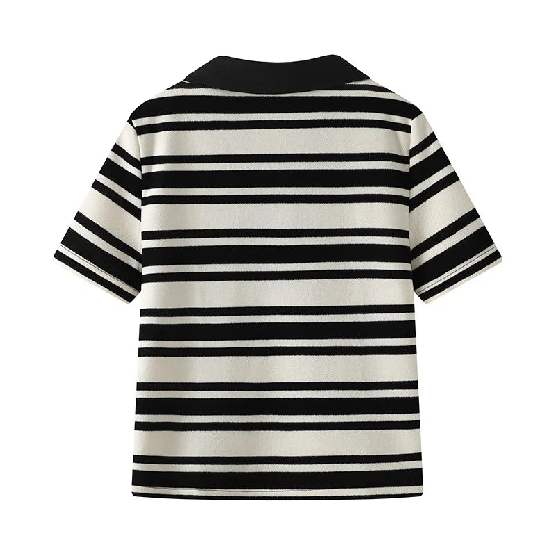 LIZAKOSHT - Black and White Striped Loose Short-sleeved T-shirt V-neck Pullover Bottoming Casual Shirt Summer New Style