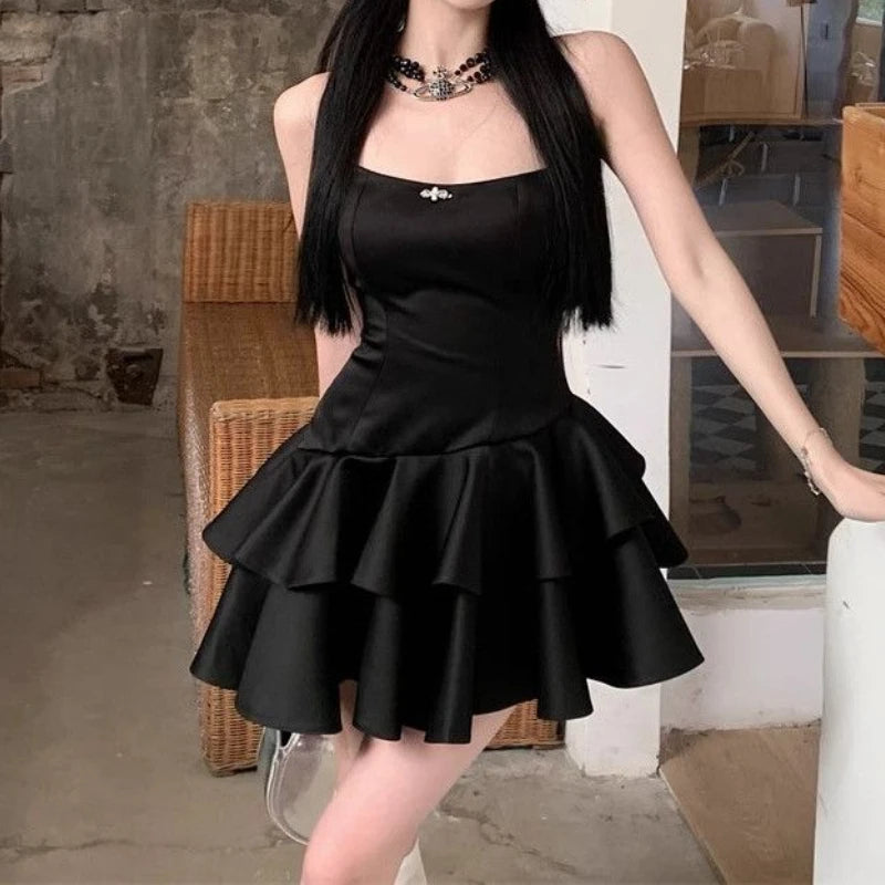 LIZAKOSHT  -  Black Strapless Sweet Satin Dresses Woman Mini Sleeveless Short Dress Coquette Aesthetic Ruffle Bodycone Summer Chic