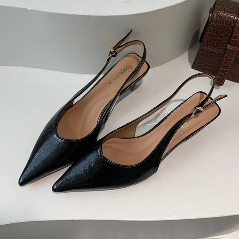 LIZAKOSHT - Black Summer New Women Sandal Fashion Pointed Toe Shallow Slip On Ladies Elegant Slingback Shoes Thin Med Heel Dress Mules
