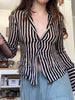 LIZAKOSHT - Black White Striped Shirts Vintage Button Up Long Sleeve Crop Top Aesthetic Elegant Streetwear Y2k Casual All Match Top