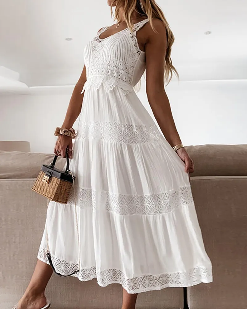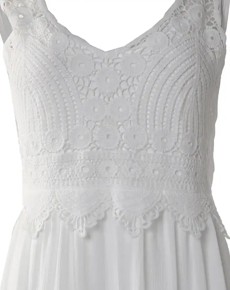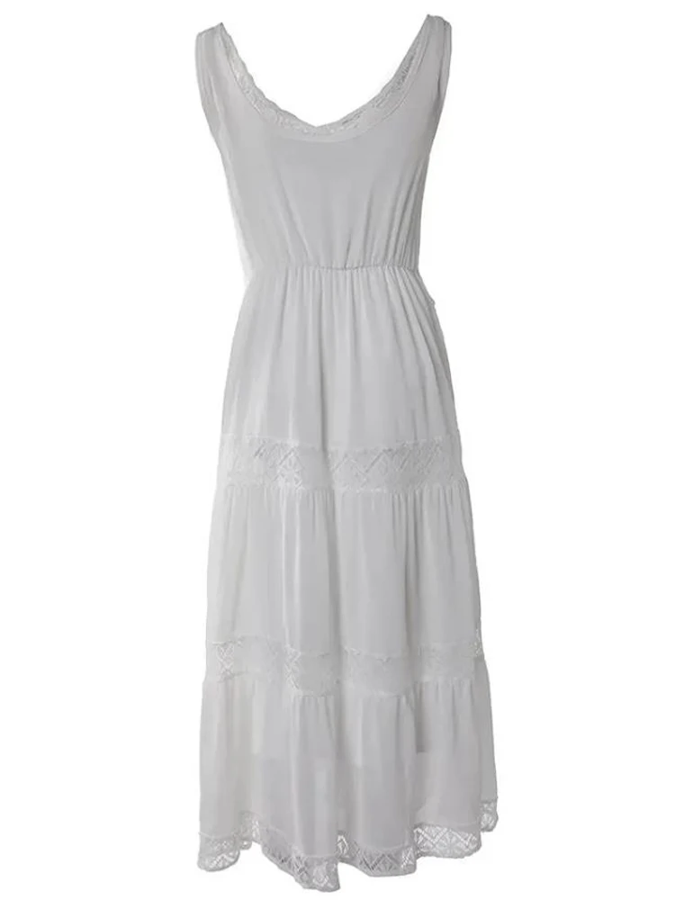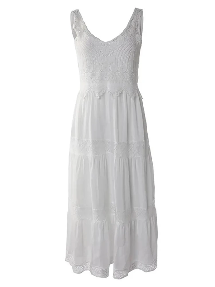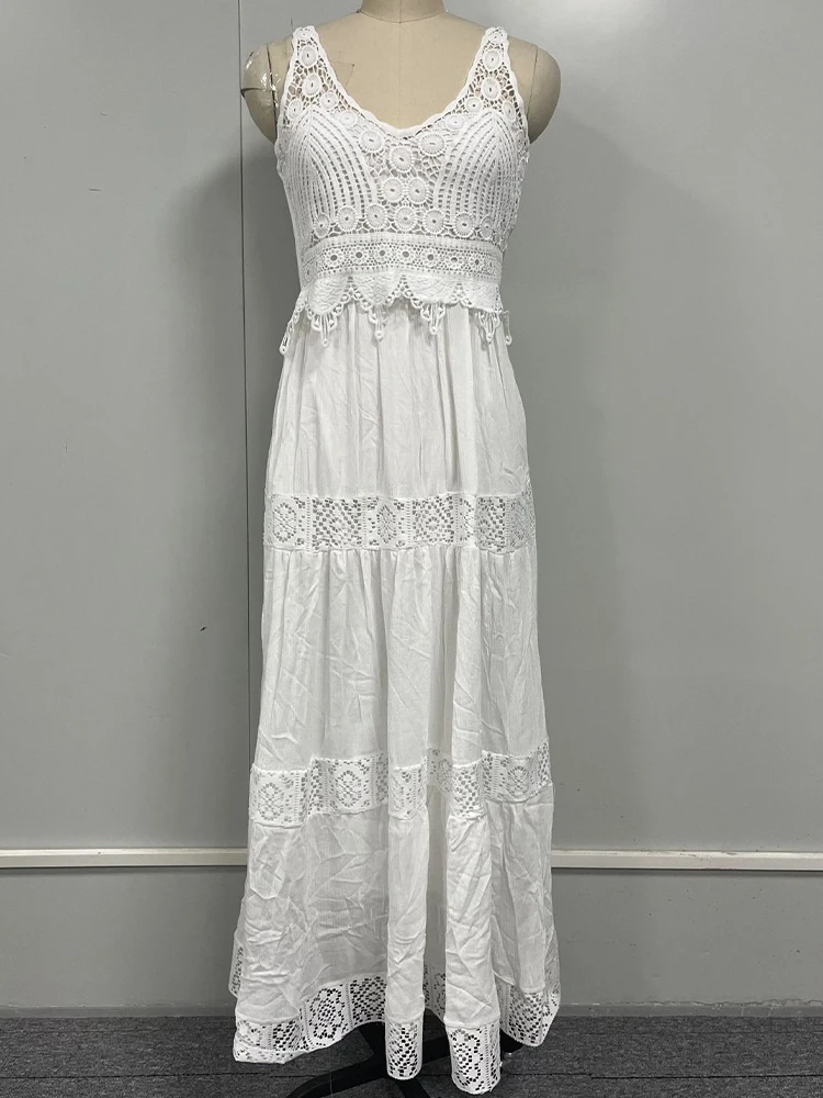 LIZAKOSHT - Boho White Long Dresses Women Summer Off Shoulder V-Neck High Waist Lace Dress Casual Beach Holiday Midi Dress Vestidos De Mujer