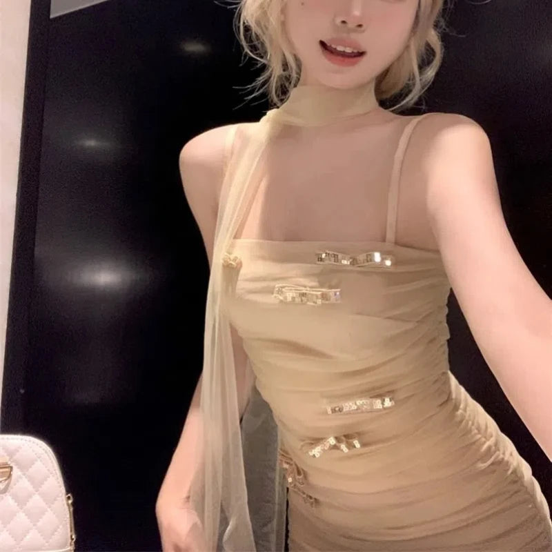 LIZAKOSHT - Bow Mesh Suspender Dress for Women Yellow Short Skirt Sexy Pure Slutty Tight Waist Pack