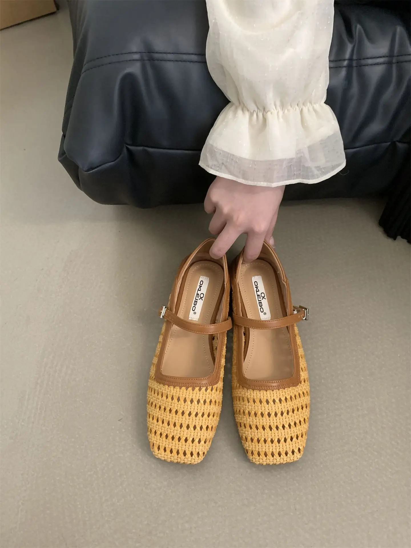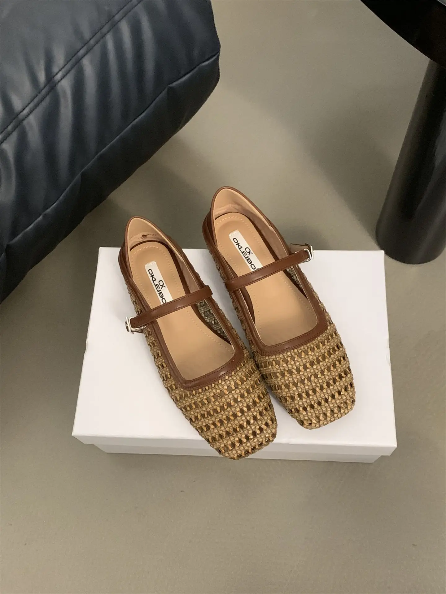 LIZAKOSHT - Braided Flat Ballet Shoes Square Toe Mary Jane Shoe Women Comfy Breathable Summer New Casual Retro Skeleton Balleting Shoes