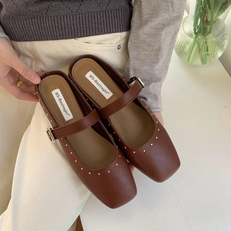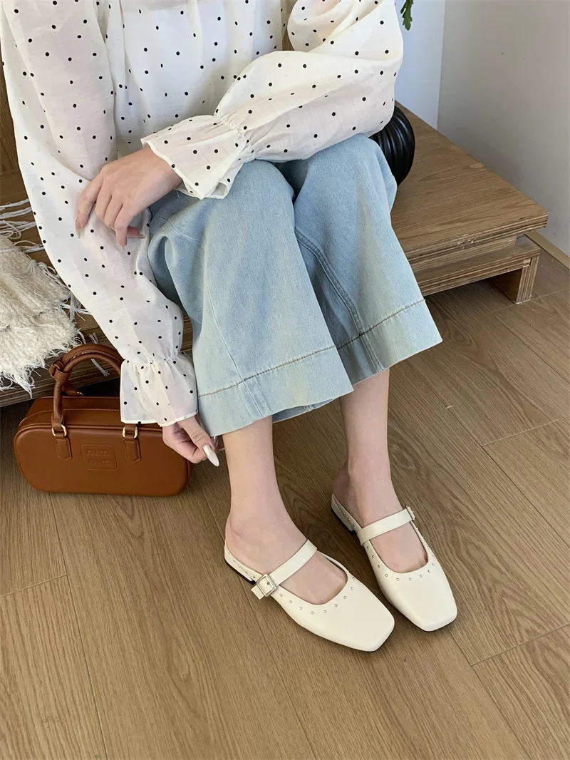 LIZAKOSHT  -  British Style Mule Slippers Women Flat Heel Shoes Brand Rivet Slide Casual Loafer Casual Flip Flops Female Outdoor Slipper Muje